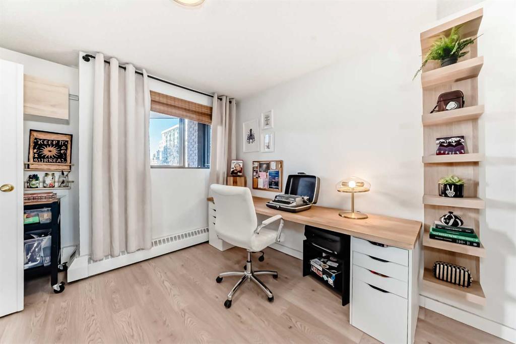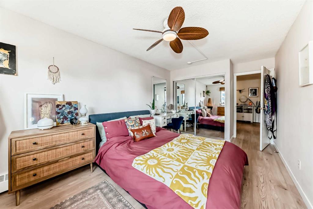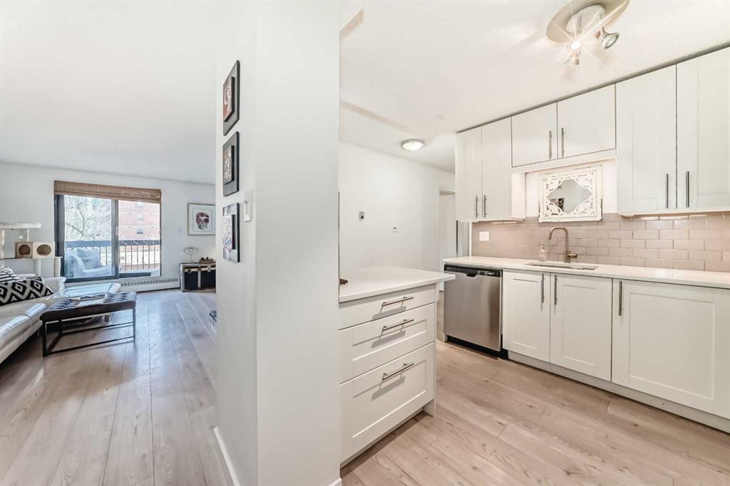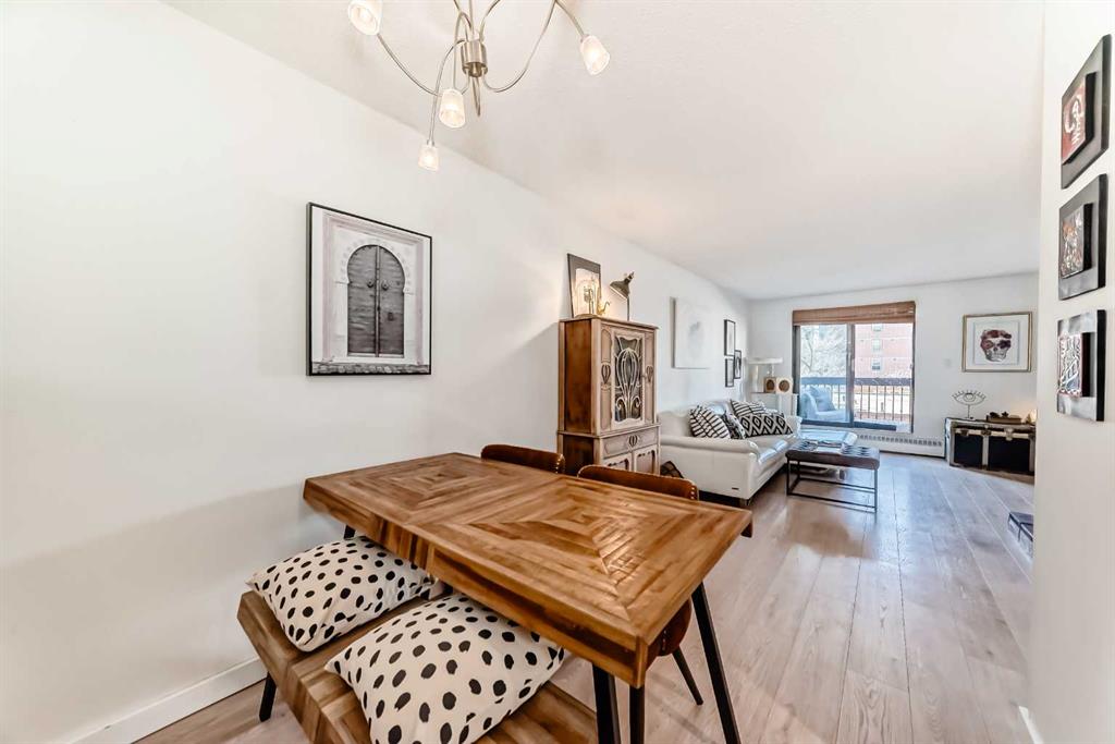 Welcome to this fabulously updated 2 bed/1 bath unit in the heart of the Beltline, just a skip the beautiful Lougheed House, and an easy walk to 17th Ave! Situated in a mature neighbourhood & well managed building, you’ll appreciate the bright & airy space with newer luxury vinyl plank throughout. The kitchen features ample storage in the contemporary cabinetry, quartz counters and newer appliances, and loads of room for a good size table in the dining room. The large living area features a gorgeous gas fireplace with smooth facade, and wide slider doors to the huge balcony, flooding the room with light, and ideal for entertaining friends & family. The generous primary bedroom has plenty of room for a king size bed and a private door to access the balcony. The second bedroom is also good sized and features double French doors bring in loads of light. The updated 4 pc bath, with updated vanity & marble counter and in unit laundry/storage complete the tour. The roof top community patio is perfect for relaxing on warm summer evenings. Or enjoy a well deserved sauna in the building after a cold winter walk. The building is ideally situated in a residential area, with parks & playgrounds nearby, and is an easy walk to 17th Ave with fantastic restaurants, shops & grocery. Book your showing today!