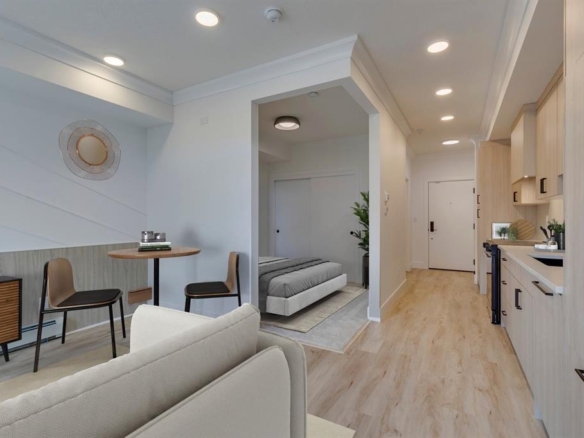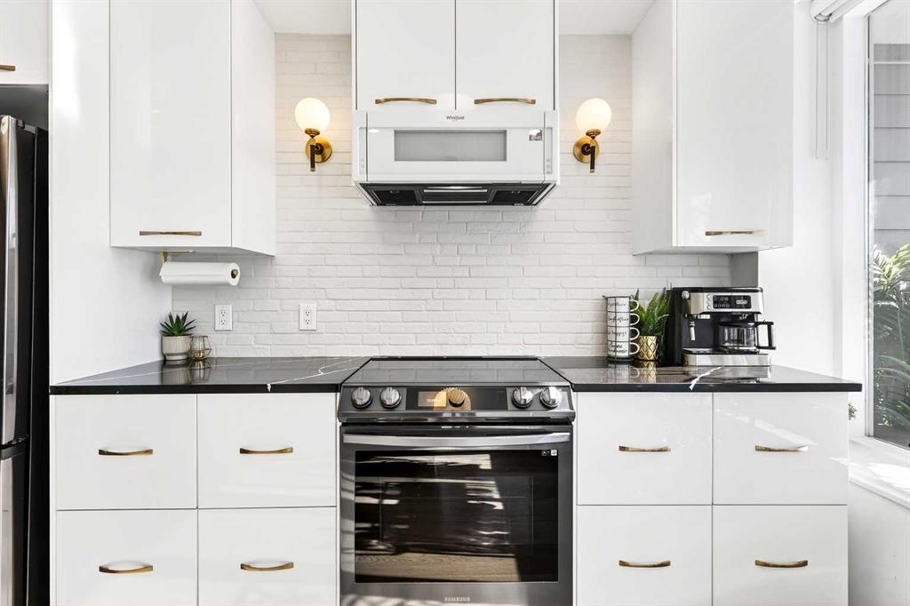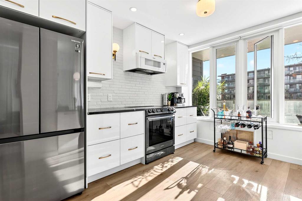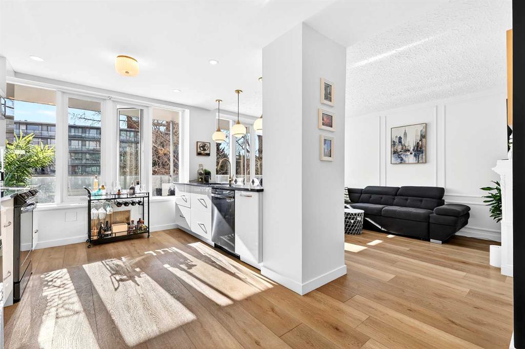 Step inside to a bright, open-concept living space filled with natural light from expansive south-facing windows. Elegant raised paneling and wide luxury vinyl plank flooring create a refined yet inviting atmosphere throughout. The thoughtfully redesigned kitchen is a culinary dream, featuring ceiling-height white cabinetry, a stylish white brick backsplash, sleek black quartz countertops, and generous counter space perfect for both everyday living and entertaining.
