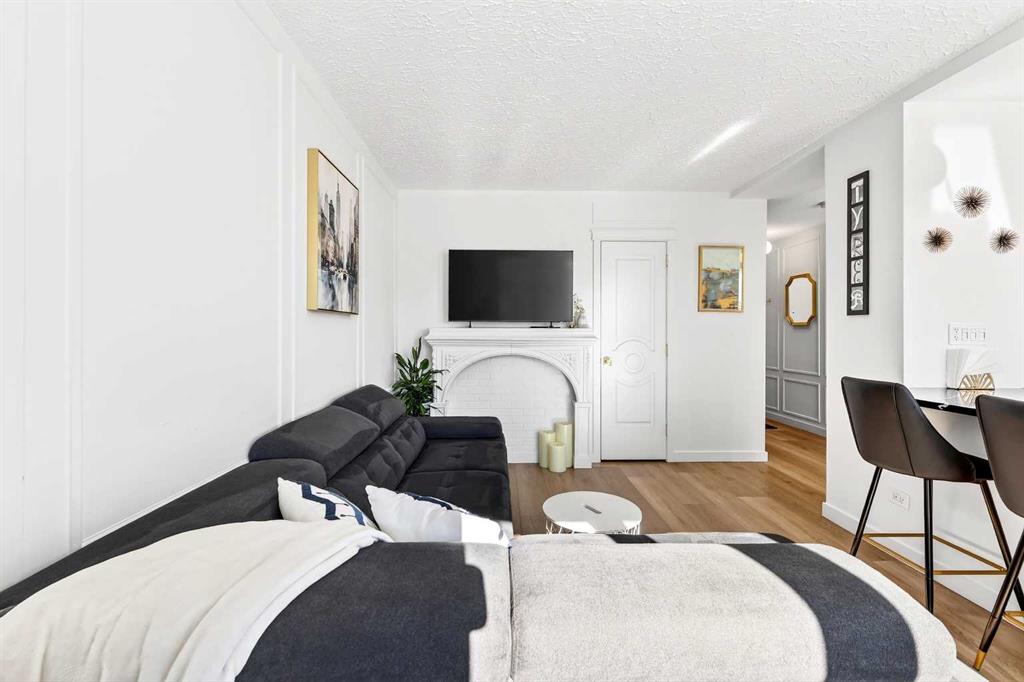 The bathroom showcases art-deco inspired tilework, complemented by warm brass fixtures, a luxurious 12-inch rain showerhead, and a cleverly integrated mirrored cabinet for additional storage. Opposite the kitchen, the living room offers a stunning focal point with raised paneling and a charming weathered white brick fireplace frame, providing the perfect canvas for your own creative décor.