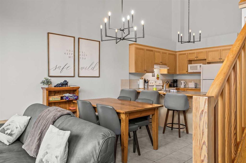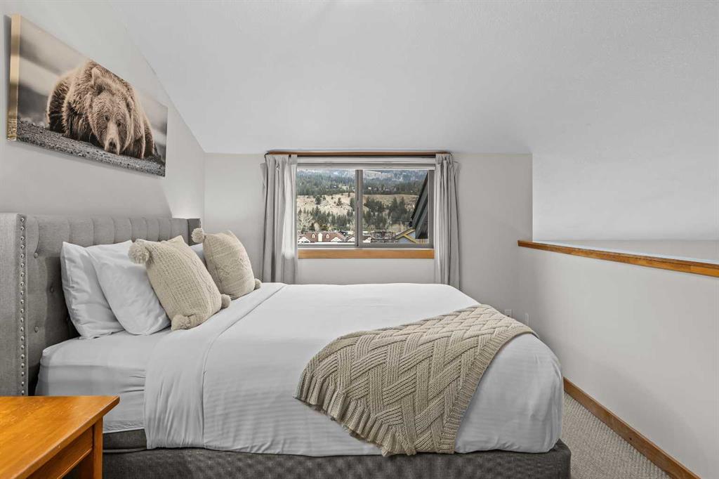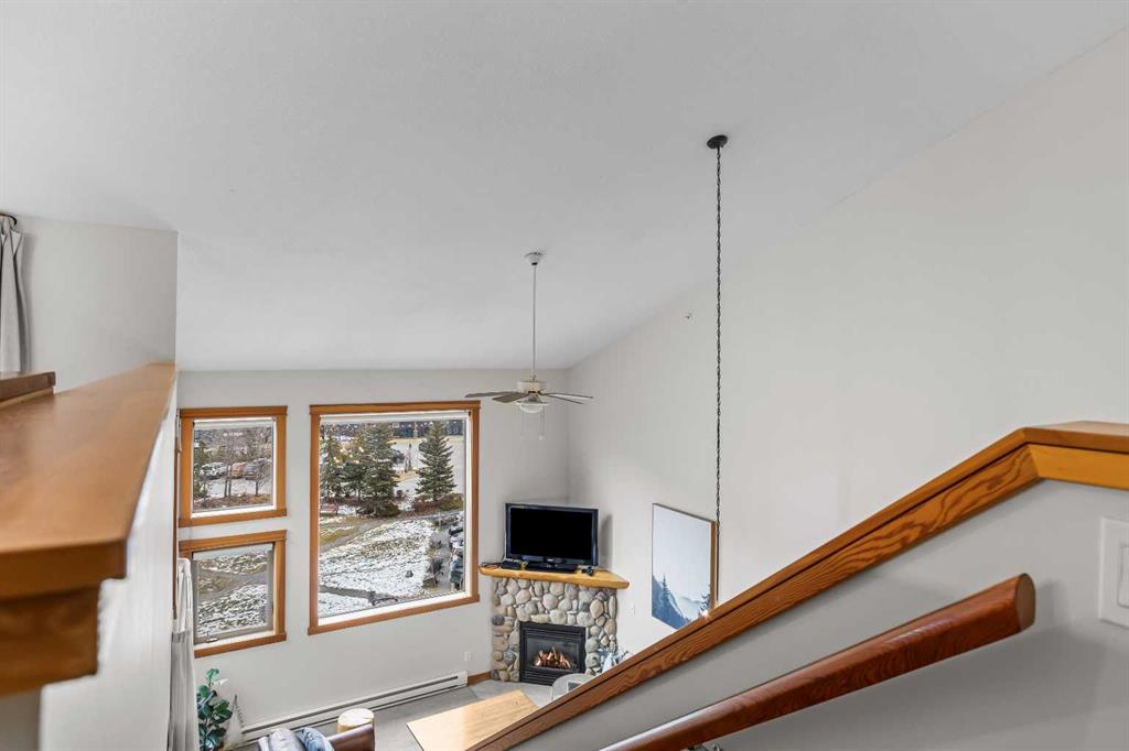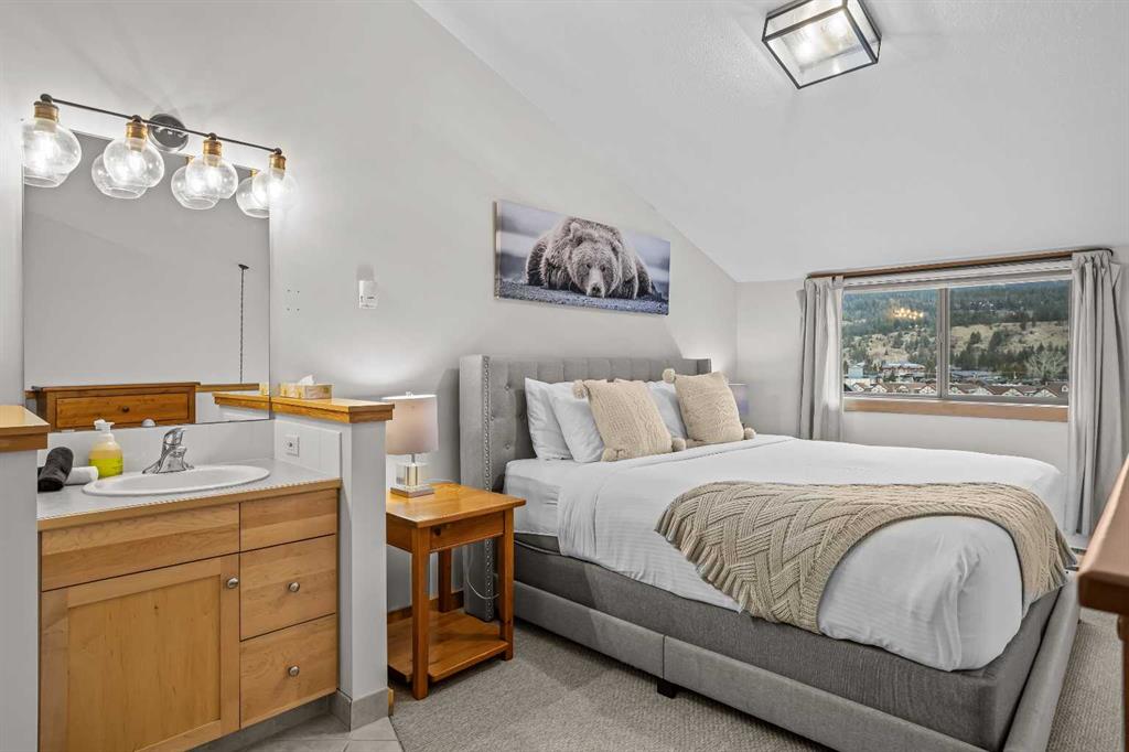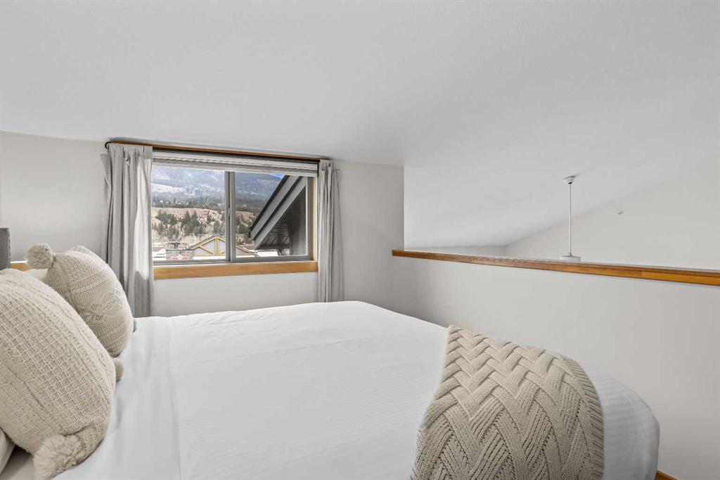 DOWNTOWN TOURIST HOME CONDO, HUGE VIEWS! Turn key opportunity with this beautiful 2 level, top floor condo zoned Tourist Home. You can choose to live there full time or to rent it nightly with fabulous returns. This condo is one of the top producing 2 bedroom rentals in the complex. 2 bedrooms, 2 baths, vaulted ceilings and gorgeous mountain views from every window. The kitchen comes complete with an eating bar and is open to the dining and living room areas. On the main floor you will also find a bedroom, 3 piece bath and laundry. The lofted master bedroom also has tremendous views and features a corner jetted tub. This complex boast 2 of the best hot tubs in town, located on the roof top. These shared amenity areas feature 360 panoramic breathtaking views. You’ll also find a full gym facility, tandem parking stall in underground secured parking plus storage. This condo is located in the center of Canmore, within walking access to all the amenities dining and shopping