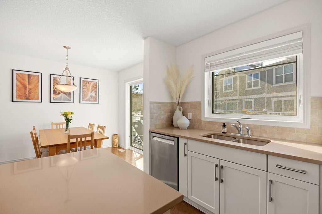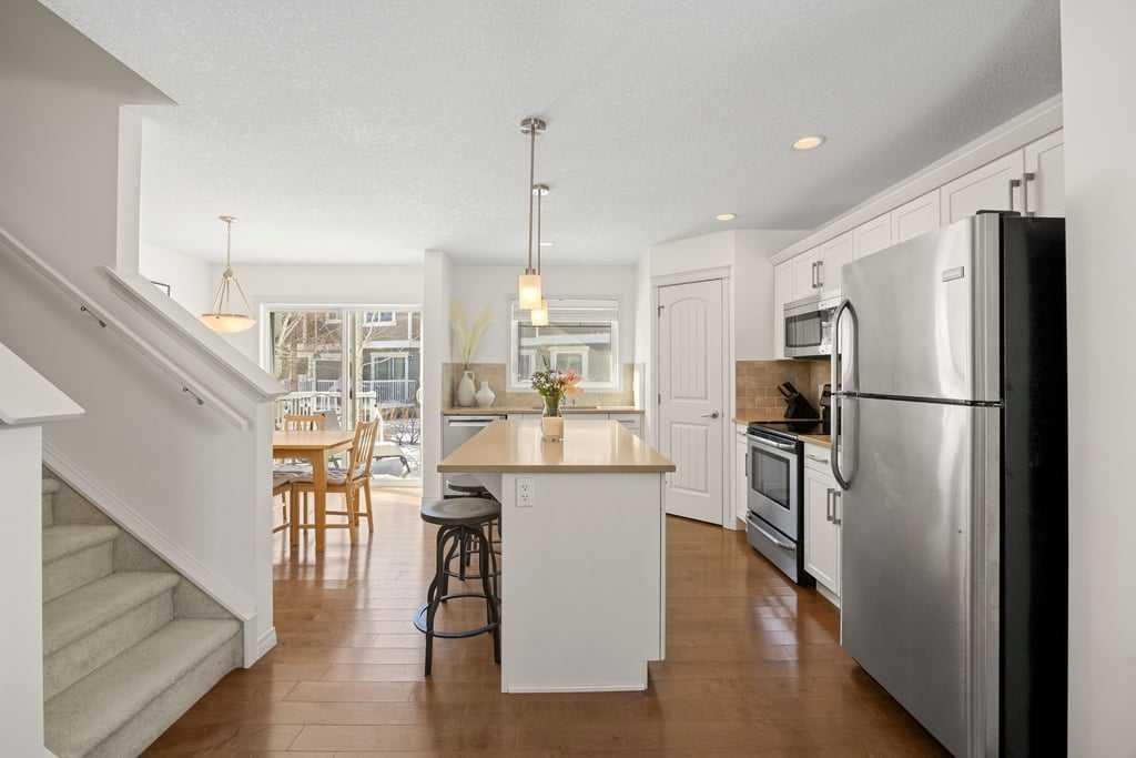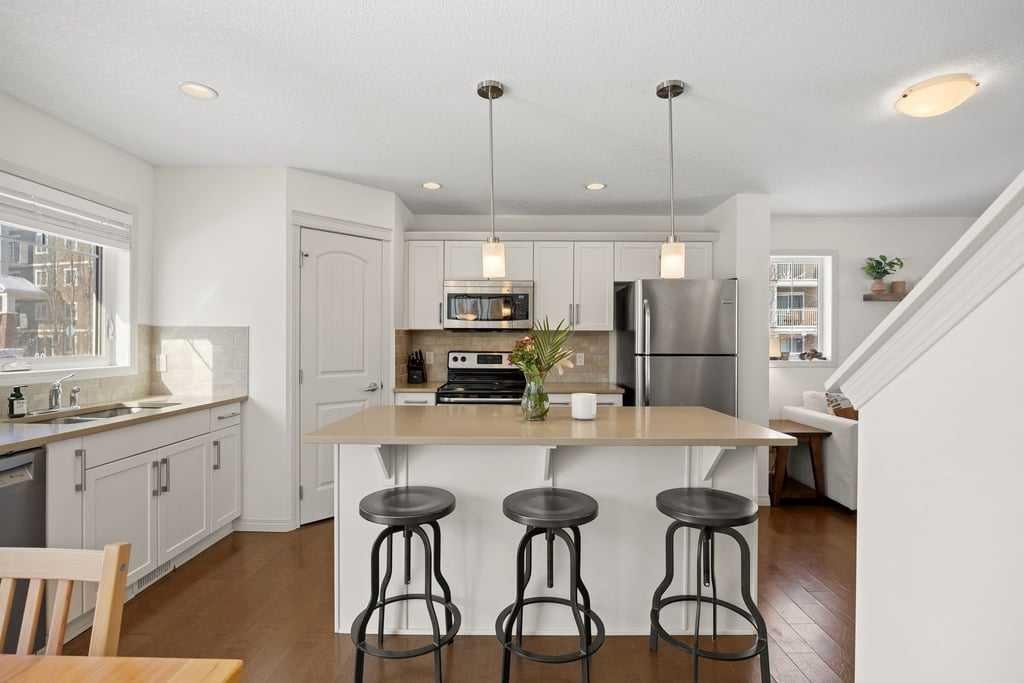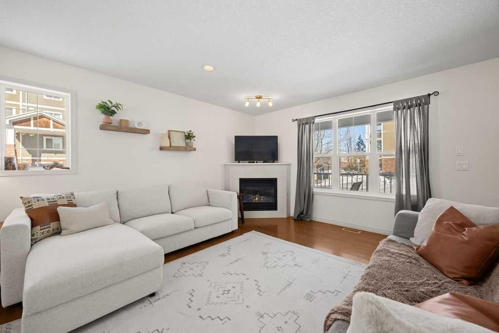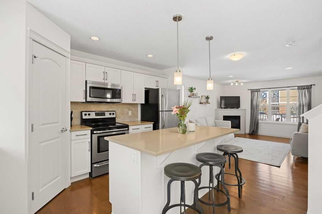 Welcome to this bright end-unit townhome in the heart of Cranston, backing onto the complex’s green belt for added space and privacy. Thoughtfully maintained and refreshed, the home features new paint throughout the main floor and upper level (February 2026), creating a clean, modern feel from the moment you step inside. The main floor offers an open, comfortable layout where the kitchen, dining, and living areas flow together seamlessly — finished with hardwood flooring, a cozy gas fireplace, stainless steel appliances, quartz countertops, a large island, and a recently upgraded Bosch dishwasher (June 2024) that enhances both style and everyday functionality.