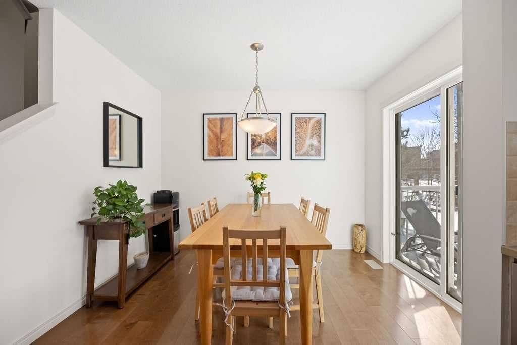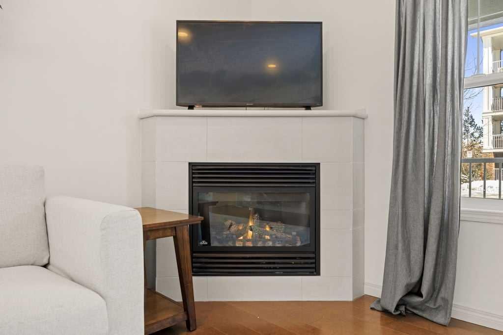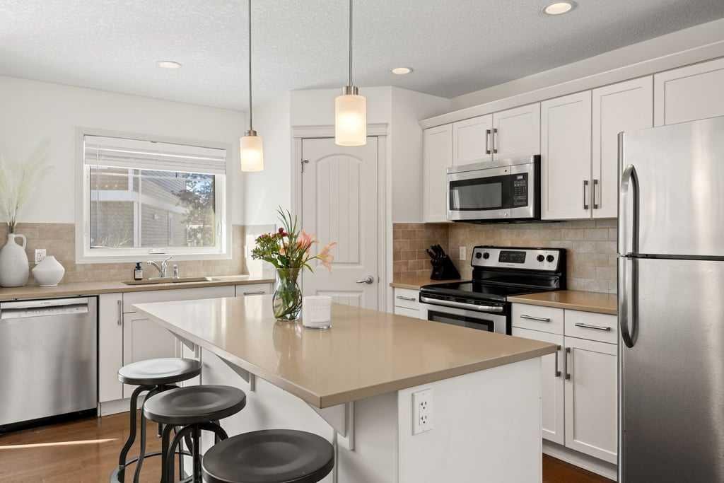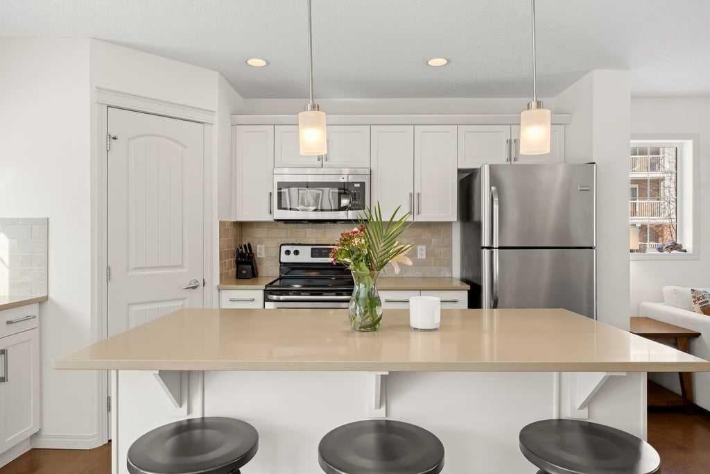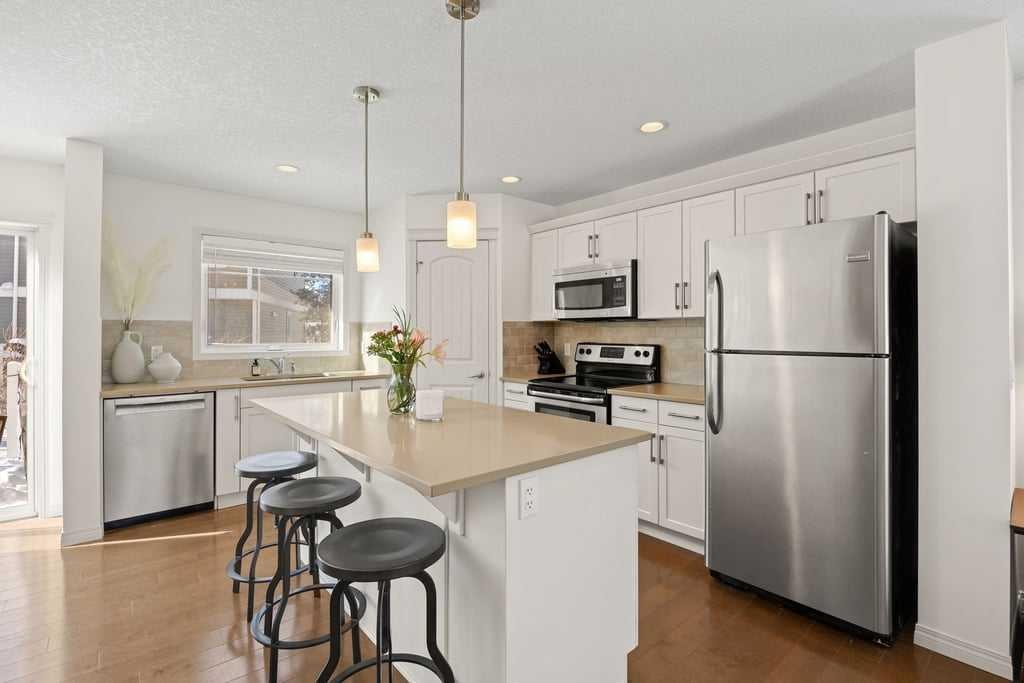 Welcome to this bright end-unit townhome in the heart of Cranston, backing onto the complex’s green belt for added space and privacy. Thoughtfully maintained and refreshed, the home features new paint throughout the main floor and upper level (February 2026), creating a clean, modern feel from the moment you step inside. The main floor offers an open, comfortable layout where the kitchen, dining, and living areas flow together seamlessly — finished with hardwood flooring, a cozy gas fireplace, stainless steel appliances, quartz countertops, a large island, and a recently upgraded Bosch dishwasher (June 2024) that enhances both style and everyday functionality.