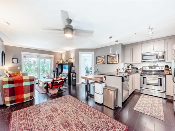 “” OPEN HOUSE: SUNDAY, APRIL 26, 3:00 – 4:30 PM “” Excellent move in ready top floor, West facing, one bedroom plus spacious den (room for a guest bed), open floor plan with kitchen, granite countertop, pantry, updated cabinetry, stainless steel appliances, spacious primary bedroom (double closet with custom cabinetry, blackout blind), full bath soaker tub with cheater door access, spacious living room with gas fireplace. Extra length west facing deck (gas line for bbq). Recently painted. Extras include: ceiling fan, vented hood fan, infloor heating, Hunter Douglas Blinds, insuite laundry One underground parking stall and extra storage locker in the parkade area. Excellent amenities location: near Bridgeland restaurants, coffee shop, parks, Bow River pathway system, Bridgeland C-Train station
