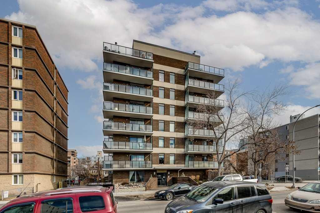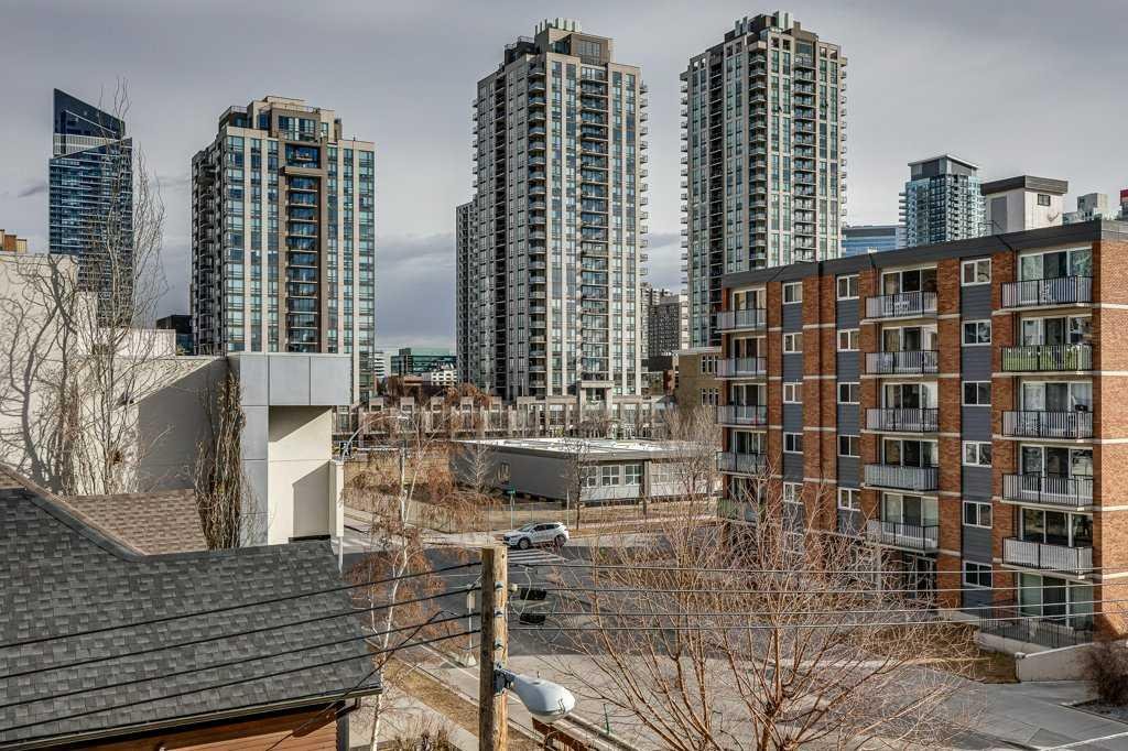 Modernly updated 2 bedroom unit with outstanding city views. Phenomenally located kitty-corner from Connaught Park and off-leash area (perfect since the building is pet-friendly upon board approval), mere steps to the infinite amenities on 14th Street and the vibrancy of 17th Ave! The perfect inner-city lifestyle awaits with nightlife, dining, pubs, cafes, diverse shops and much more just moments away then come home to a quiet treelined street. Inside this beautifully updated unit are gleaming hardwood floors, a neutral colour pallet, trendy barn sliding doors, designer finishes and cleverly incorporated storage solutions. The open floor plan is bright and spacious with clear sightlines amongst all the principal rooms encouraging unobstructed conversations. Culinary adventures are inspired in the stunning kitchen featuring full-height sleek cabinetry, stainless steel appliances, quartz countertops and a large island with casual breakfast bar seating. A dedicated dining area easily hosts larger gatherings, while the adjacent living room invites you to sit back and relax. The expansive “L” shaped, covered balcony entices warm weather barbecues, peaceful morning coffees and unlimited people watching with the city lights as the enchanting backdrop. Both bedrooms are generously sized with large closets and easy access to the stylish 4-piece bathroom. In-suite laundry too for ultimate convenience. Assigned underground parking adds to your comfort, allowing you to leave your vehicle at home while you explore Calgary’s premier entertainment district. Everything is close at hand plus just a quick bike ride to the river, downtown and beyond! Truly an outstanding location for this move-in ready home.