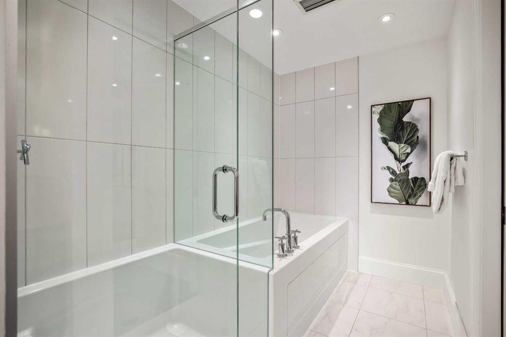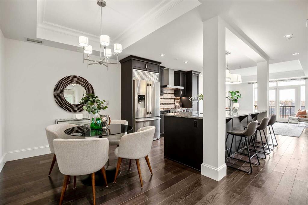 Experience luxury condo living in this beautiful, immaculately maintained 1-bedroom, 1-bathroom residence in this exquisite Champagne development. The unbeatable location has you walking out of your building just steps from the Bow River Pathway system, walking distance to Sue Higgins Off-Leash Dog Park, quick access to Deerfoot Trail, and walking-distance to shopping, restaurants, YMCA and more. This unit is located on the 4th floor of this quiet complex, delivering “penthouse qualities” with no overhead balcony, allowing natural light to flood the space. The interior is rich with quality and taste, featuring fresh paint, new carpet in the bedroom, a brand new microwave, tray ceilings, engineered hardwood flooring, 9 ft ceilings, marble tile, and top-of-the-line finishings. The chef’s kitchen is centrally located within the unit, outfitted with premium stainless-steel appliances, including a gas range, an oversized granite island, soft-close cabinetry, making it perfect for entertaining or everyday casual dining. The bedroom can easily accommodate a king-size bed and more. The spa-like ensuite bathroom invites relaxation, offering a soaker tub as well as a tile shower. Enjoy the convenience of underground parking stall, a titled storage unit, bicycle storage, and a car wash bay.