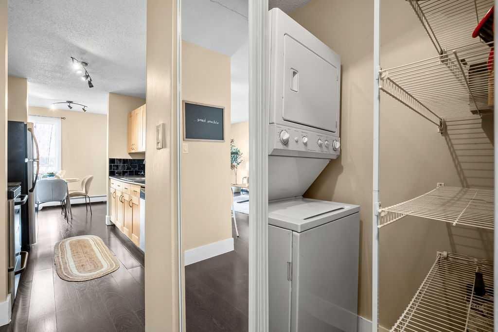 Enjoy the convenience of in-suite laundry and a designated covered parking stall located just steps from the back entrance.