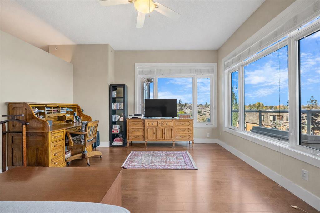The top of the building is a small club. And membership is limited. Perched above the walking paths, stretching over the golf course and into the city skyline beyond, this 2,084 sqft penthouse isn’t just space — it’s presence. The sheer size checks the boxes and the 3 bedroom layout seals the deal. Transition from a life of cutting grass + shovelling snow to a lifestyle of sitting back + enjoying the ease of condo living. Over $100,000 has been invested with intention and refinement. Every upgrade curated – every finish deliberate. Step foot into a gourmet kitchen dressed in quartz, anchored by a gas range, stainless steel appliances, wine fridge, full pantry and customized pull-out drawers throughout. The heart of the home boasts seamless sight lines across the open-concept layout will be the desired spot for many gatherings in the years to come. The connected living + dining spaces invite celebration — whether it’s dinner for twelve or a quiet glass of wine by the gas fireplace. This is where new memories with those closest to you commence. From 10-foot ceilings to immersive built-in audio and your own projection theatre, every detail was designed for effortless living — complete with a full Hunter Douglas blinds package and phantom screens for year-round comfort. Retreat to your nearly 300 sqft primary suite, wrapped in a wall of windows. The ensuite elevates daily ritual with dual sinks and a steam shower with bench, while a fully built-out walk-in closet keeps life organized. With three rooms on hand, it provides flexibility for guests and potential for a den, lounge or library. Let’s move on to the statement piece – your 600 sqft outdoor terrace. Morning coffee above the fairways – sunset cocktails over the city lights. This exterior haven provides you the space to entertain + exhale. The purchase will come with two underground, side by side parking stalls and a separate storage locker for seasonal goods. You will also find a car wash bay + bike storage onsite. The community amenities include a large fitness facility along with recreation room which hosts several resident meet ups + gatherings throughout the year. A location close to all your daily requirements, mere blocks to the c-train, walkable to the golf course and minutes into the downtown office core. This Penthouse more than an address – it’s a statement piece, a vantage point and a lifestyle reserved for those who prefer privacy. Your opportunity to live where others look up.
