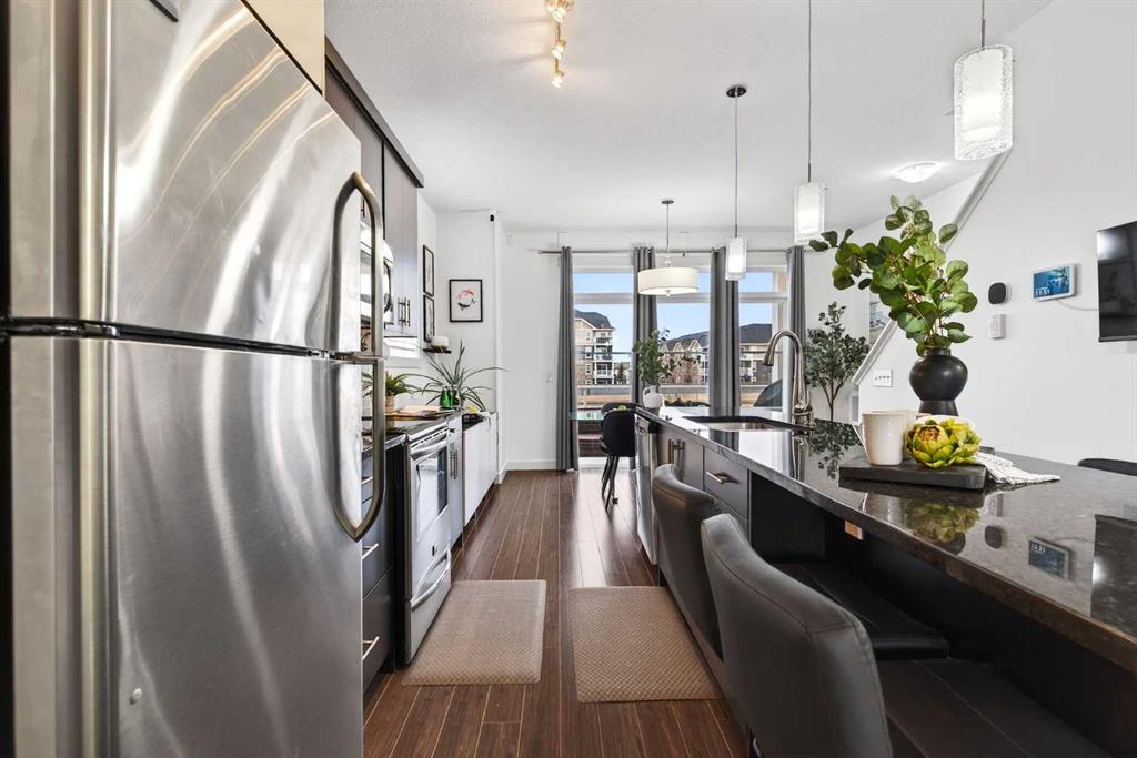 SHOW HOME upgrades – END-UNIT 1,380 sq. ft., this bright townhouse in Redstone features 2 bedrooms, 2.5 bathrooms, with unobstructed Mountain VIEWS off the dining room balcony & master bedroom, a main-level office/den/gym/ flex room, and an extra-large single attached garage. Enjoy bright sunshine throughout the entire home, the large windows in the primary bedroom. Added privacy bonus: NO neighbours directly facing your front door.