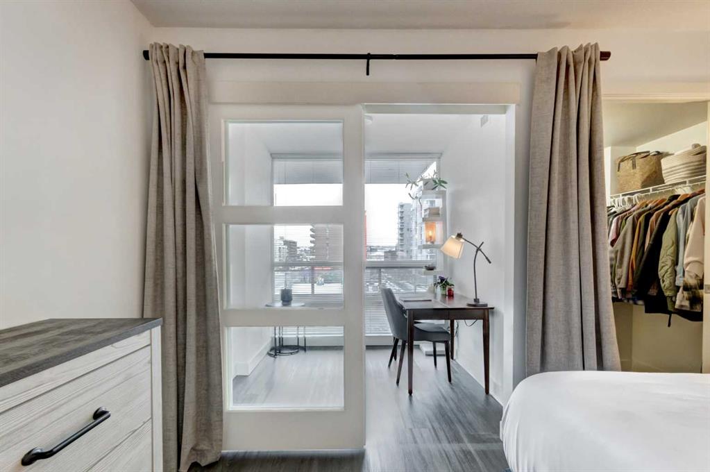 Welcome to this bright & beautifully designed 1-bedroom plus den home featuring a large west-facing balcony that spans the full width of the unit – relax as you watch the sunset! The open-concept layout is filled with natural light, creating an inviting & airy living space. The kitchen offers granite countertops, crisp white cabinetry & an extended eating bar, making it ideal for cooking, casual meals & entertaining. The spacious living/dining room easily accommodates a full dining table, offering flexibility for both daily living & hosting. The king-sized primary bedroom provides comfort & room to spare & the cheater ensuite boasts a soaker tub & separate shower. Imagine working from home in your den that overlooks the balcony through floor-to-ceiling windows & is generously sized to fit a queen bed, making it an excellent guest room, office, or multipurpose space. Located in a well-constructed concrete building, this home features durable vinyl plank flooring, adding style & practicality. Included is one titled underground parking stall & a separate storage locker for added convenience. Residents enjoy an impressive array of amenities, including concierge service, a fitness centre, a guest suite, a social room, & underground visitor parking. All of this is just steps from grocery stores, boutique shopping, restaurants, coffee shops, & pubs—offering an unbeatable urban lifestyle. Welcome home! You’ll love living here!!!