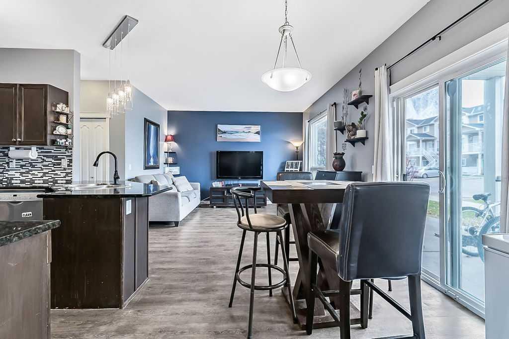 The open-concept floor plan is filled with natural light and features a stylish kitchen with dark granite countertops, breakfast bar, and adjoining dining area with sliding doors leading to the east-facing patio. The spacious living room connects seamlessly to the kitchen and dining area, creating an inviting space for everyday living and entertaining.