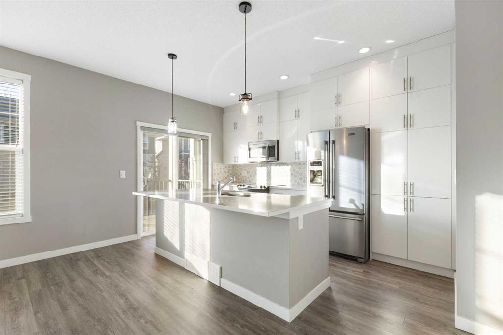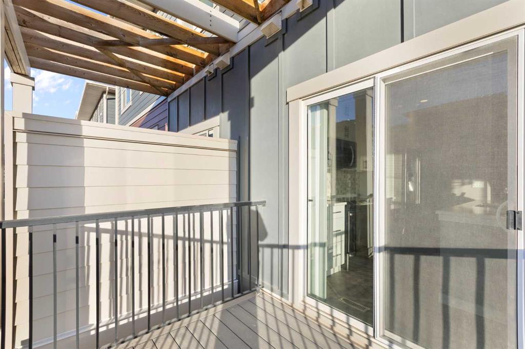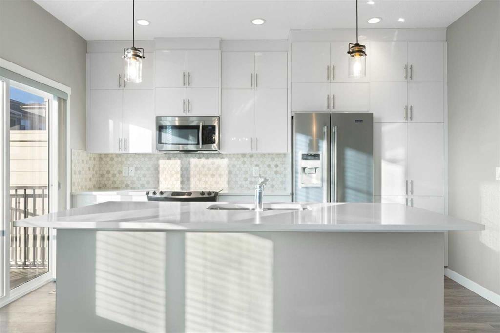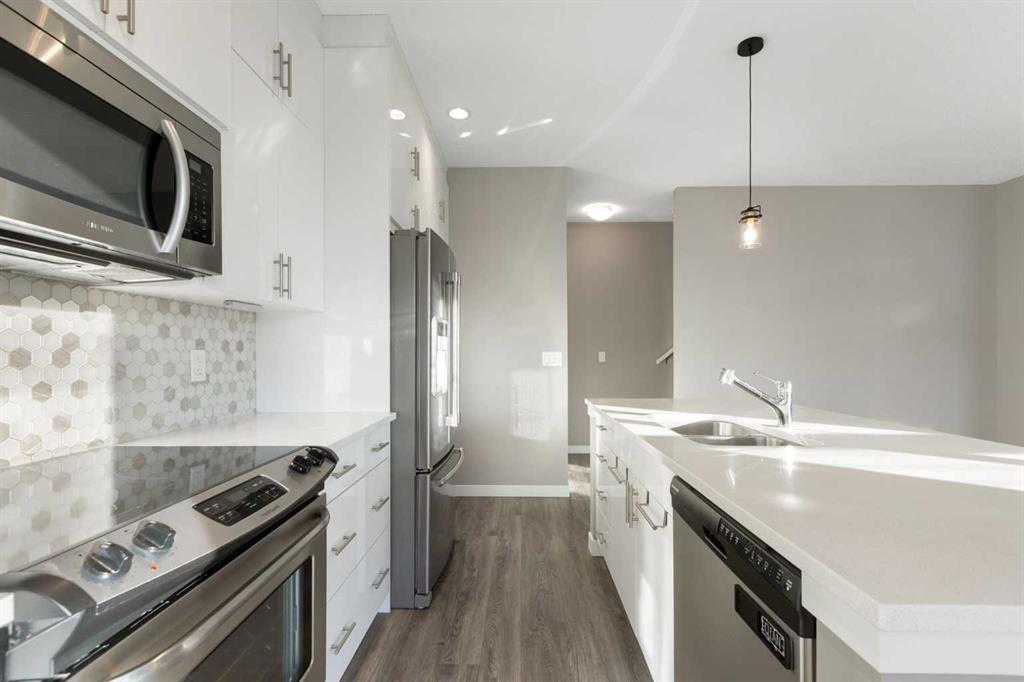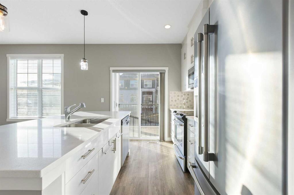 The open-concept main floor is filled with natural light from additional end-unit windows and showcases 9’ ceilings, modern vinyl plank flooring, and a timeless & modern colour palette. The kitchen is both stylish and functional, featuring quartz countertops, stainless steel appliances, a large centre island with eating bar, floor-to-ceiling cabinetry, and a sleek tile backsplash. The dining and living areas flow seamlessly onto the sunny south-facing balcony overlooking green space, complete with a gas line for BBQ and room for outdoor seating — a rare and peaceful setting for townhouse living.