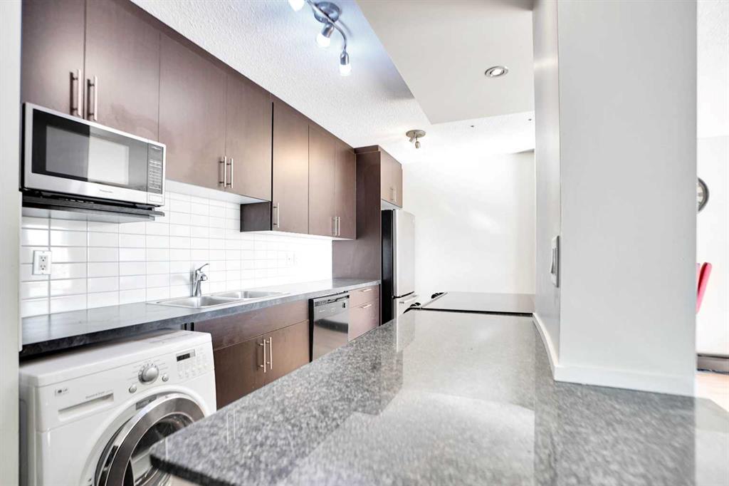 Welcome to this beautiful well cared for TOP FLOOR 1-bedroom south facing condo with in suite laundry, nestled in the vibrant community of Windsor Park—just steps from Chinook Centre, the LRT, parks, shopping, restaurants, schools, and everyday amenities. Inside you will find a bright, open-concept layout. The modern kitchen features granite countertops, wood-stained cabinetry accented by a subway tile backsplash and stainless steel appliances. The living room allows for natural light from the large sliding doors that lead to a private balcony with picturesque views of the surrounding neighborhood. Laminate flooring throughout the kitchen and living room. The carpeted bedroom will accommodate any sized bed and includes a double sliding door closet. The updated 4-piece bathroom boasts a vessel sink, ceramic tile floor, tub/shower and thoughtful details like updated lighting and plumbing fixtures. Enjoy the added convenience of in-suite laundry. Additional highlights include an assigned parking stall with electric plug-in and the peace of mind that comes with a solid concrete, low-turnover, well-managed building. This 4th level unit is move-in ready with quick possession available—an exceptional opportunity to own in one of Calgary’s most convenient and desirable locations.