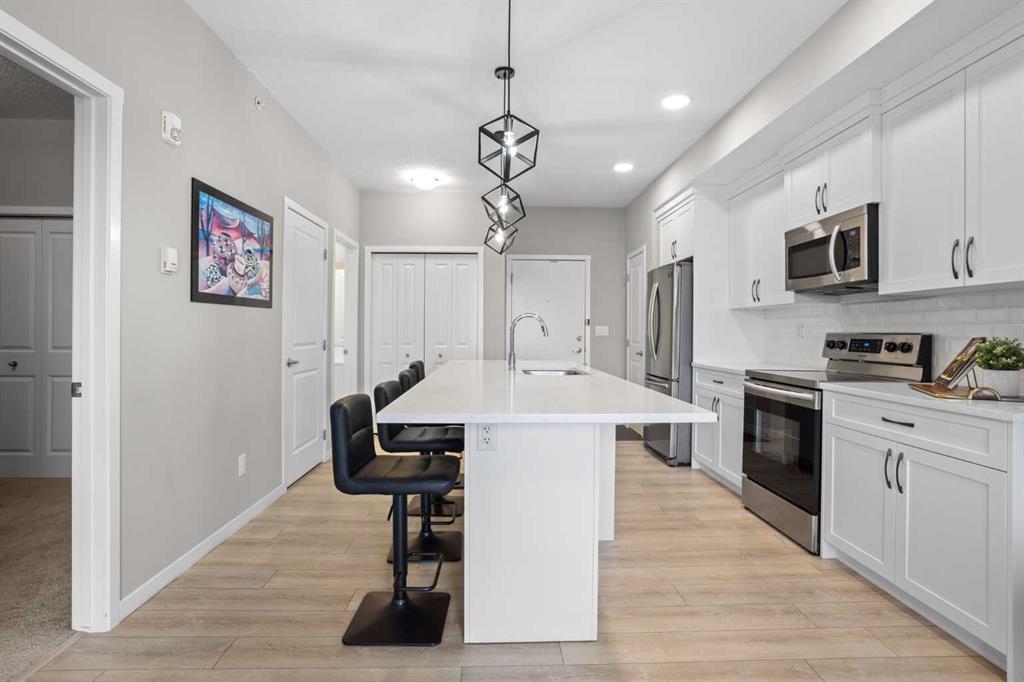 With nine-foot ceilings and west-facing windows, the space feels open, bright, and welcoming throughout the afternoon and evening. The open-concept kitchen anchors the layout with white shaker cabinetry, soft-close doors, extended-height uppers, quartz countertops, a mosaic tile backsplash, pendant lighting, and modern stainless steel appliances, including a full-size fridge and microwave hood fan. A unique two-sided island provides seating on one side and additional space on the other, perfect for a breakfast nook or casual dining.