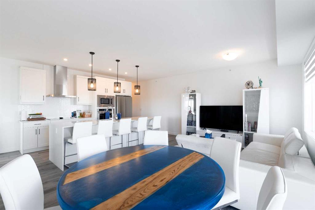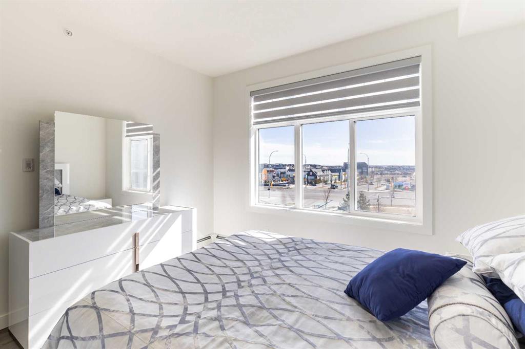 Welcome to Auburn Rise! Here’s your rare opportunity to own one of the best in the building in one of Calgary’s few LAKE communities; A TOP FLOOR, CORNER UNIT featuring TWO BEDROOMS, TWO FULL BATHROOMS, AIR-CONDITIONING and underground parking for TWO VEHICLES! This beautiful building is part of a well-managed complex offering modern style and contemporary finishes that rival most condos in the City, and built only 4 years ago. Step into Unit 406 and you’re welcomed with tall 9-foot ceilings and wide-plank LVP flooring that flows throughout, leading to large windows that completely fill the open-concept living space with BRIGHT natural light. With classic shaker style cabinets in crisp white, and a huge 6-person island with double-waterfall quartz counters and undermount composite sink, the kitchen is a host’s dream come true for guests and family gatherings alike. A suite of quality stainless appliances include a built-in stove and microwave oven, along with a glass countertop range promising quick and easy cleaning once the cooking is done.