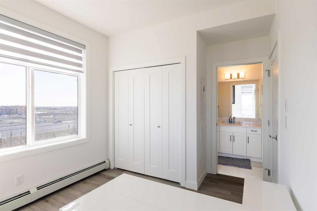 Step outside and you’ll find a gracious patio, extending nearly 20 FEET along the front of the unit, giving incredible PANORAMIC VIEWS clear to the skyscrapers of the downtown core, and even to the mountaintops to the West, where you’ll get to watch Calgary’s famous SUNSETS! The master bedroom is found tucked away around the kitchen, with an east window offering bright and sunny mornings (and cool evenings), then leading to a walk-through closet which gives way to a private 4-pc ensuite bathroom with dual-sink vanity. The second bedroom also benefits from this east exposure but also offers private access to the shared 4-pc bathroom thanks to a convenient pocket door, meaning guests don’t need to leave the bedroom for access.