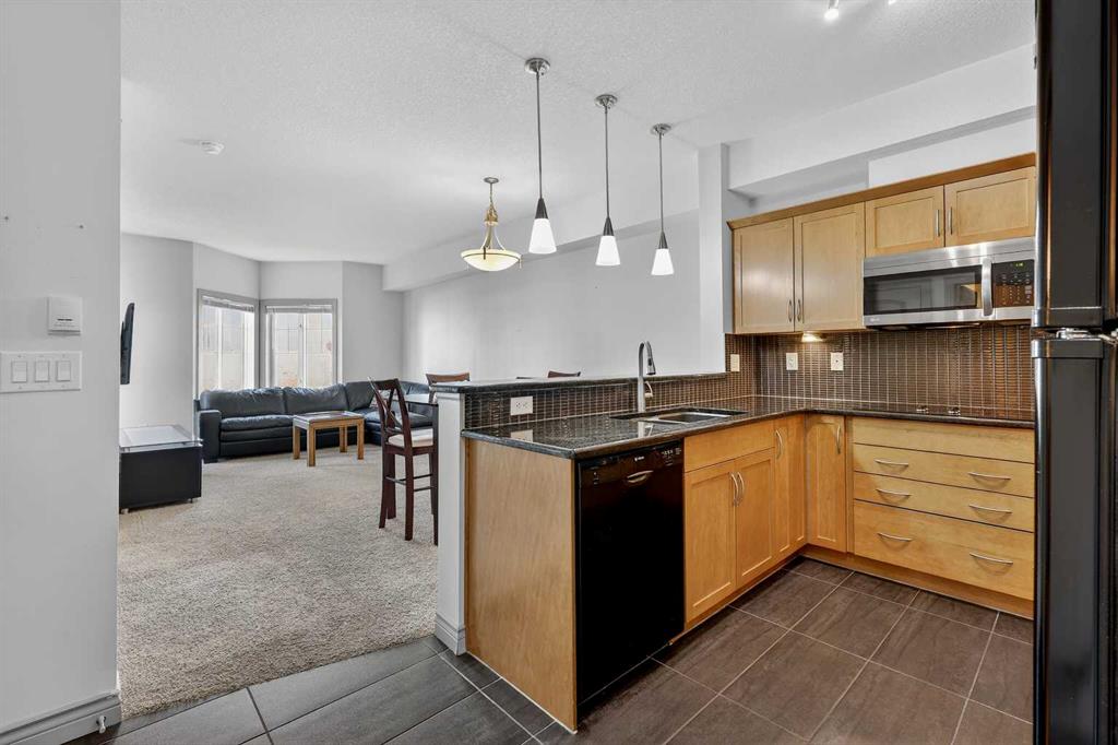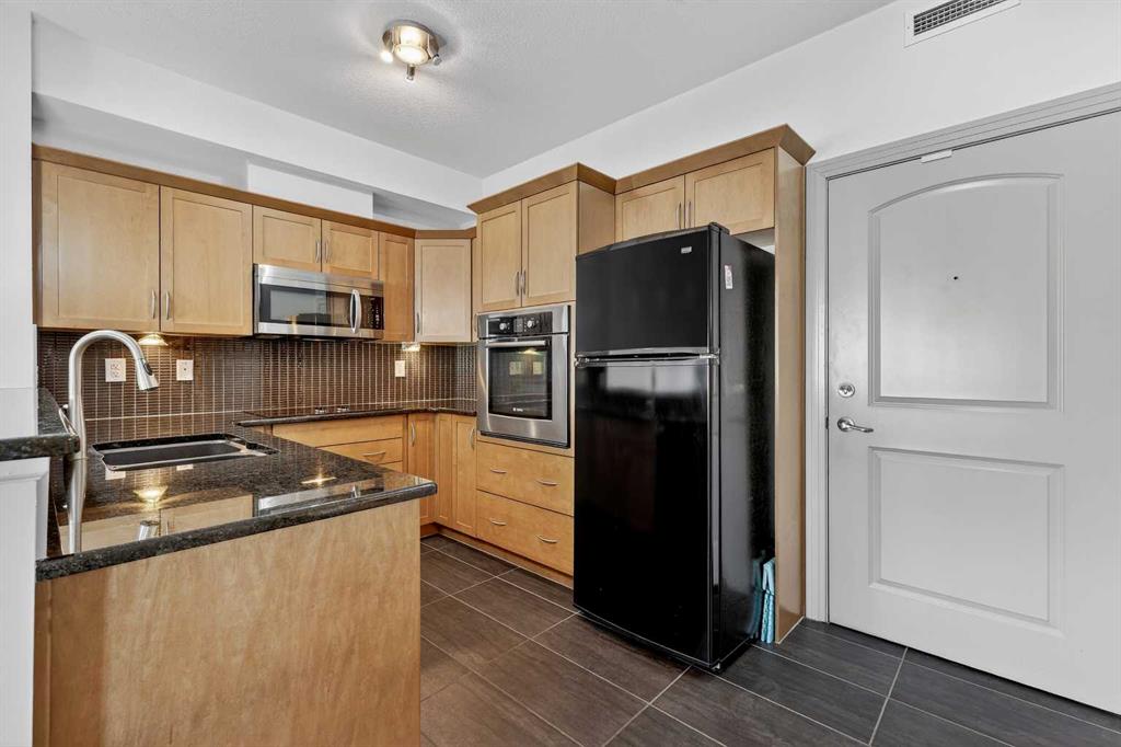 Welcome to this exceptional top-floor one-bedroom, one-bathroom residence in the highly sought-after Red Haus complex. Thoughtfully designed, this home features a modern kitchen complete with stainless steel appliances, granite countertops, and a raised breakfast bar—ideal for casual dining and entertaining. The open-concept layout offers a spacious living area and a bright dining space enhanced by upgraded tile flooring. Step outside to the large private balcony, equipped with a gas line for your BBQ, creating the perfect extension of your living space for relaxing or hosting guests. The generously sized primary bedroom includes a walk-through closet leading to a well-appointed four-piece bathroom. Additional conveniences include in-suite laundry with a full-size front-loading washer and dryer. This unit also comes with titled parking and a titled storage locker, adding both value and practicality. Ideally located within walking distance to shopping, restaurants, and public transit, this home offers outstanding everyday convenience. Residents of Red Haus enjoy exclusive access to the Residence Club, featuring a fully equipped fitness centre and an inviting entertainment area—perfect for an active and social lifestyle.