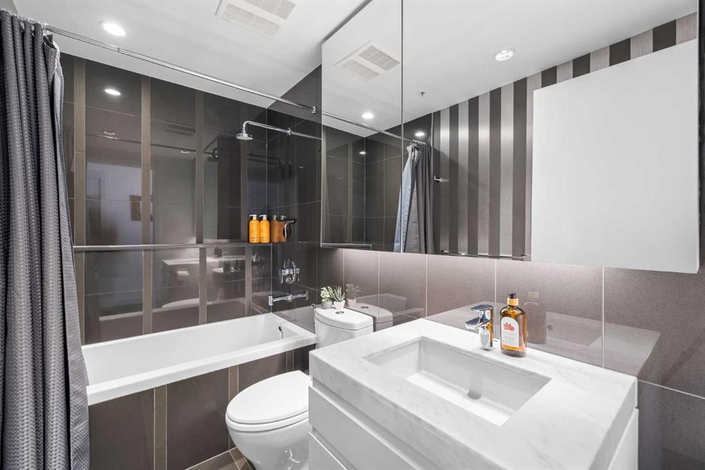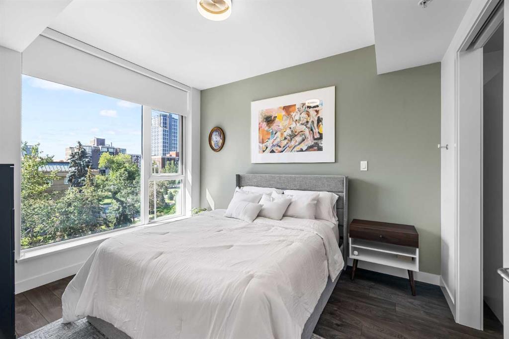 Welcome to Park Point, where elevated downtown living meets one of the Beltline’s most coveted locations. This stunning corner residence showcases sweeping southeast views over Central Memorial Park and the Calgary Tower, offering an ever changing backdrop of greenery, fountains, and city energy from the living room, primary bedroom, and private balcony. Inside, the home is bathed in natural light from expansive windows and finished with wide-plank laminate flooring throughout, creating a clean, modern aesthetic. Just off the entry, you’ll find a beautifully designed full bathroom featuring high gloss tile, a white marble vanity, and premium Hansgrohe fixtures, along with a conveniently placed laundry area and front closet.