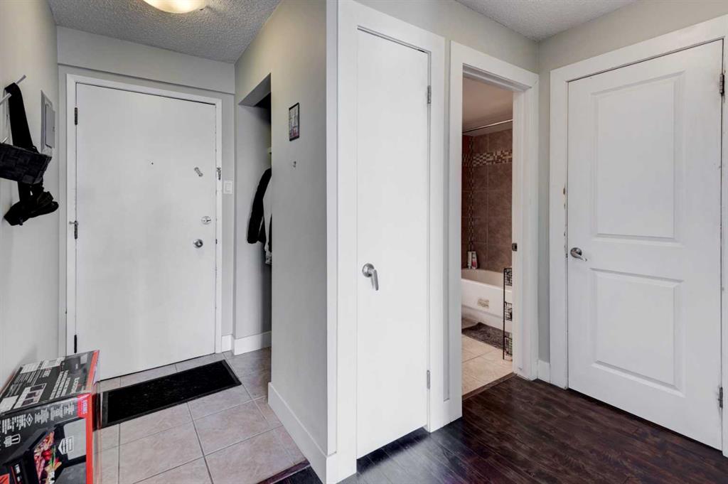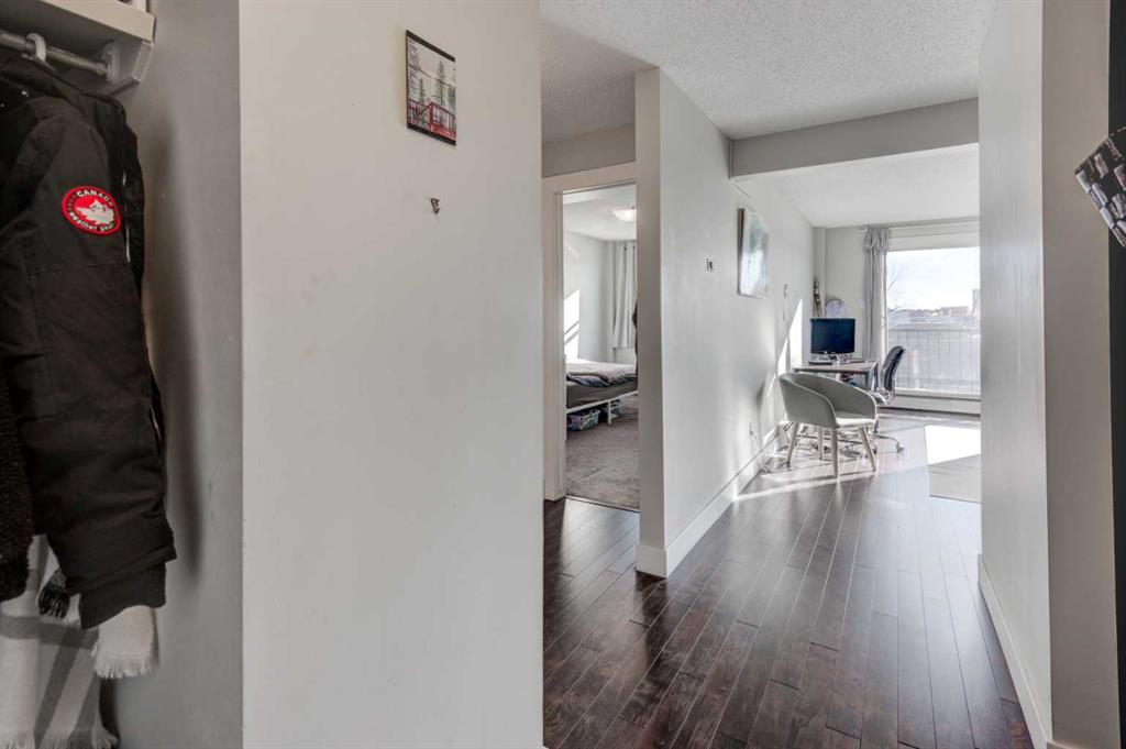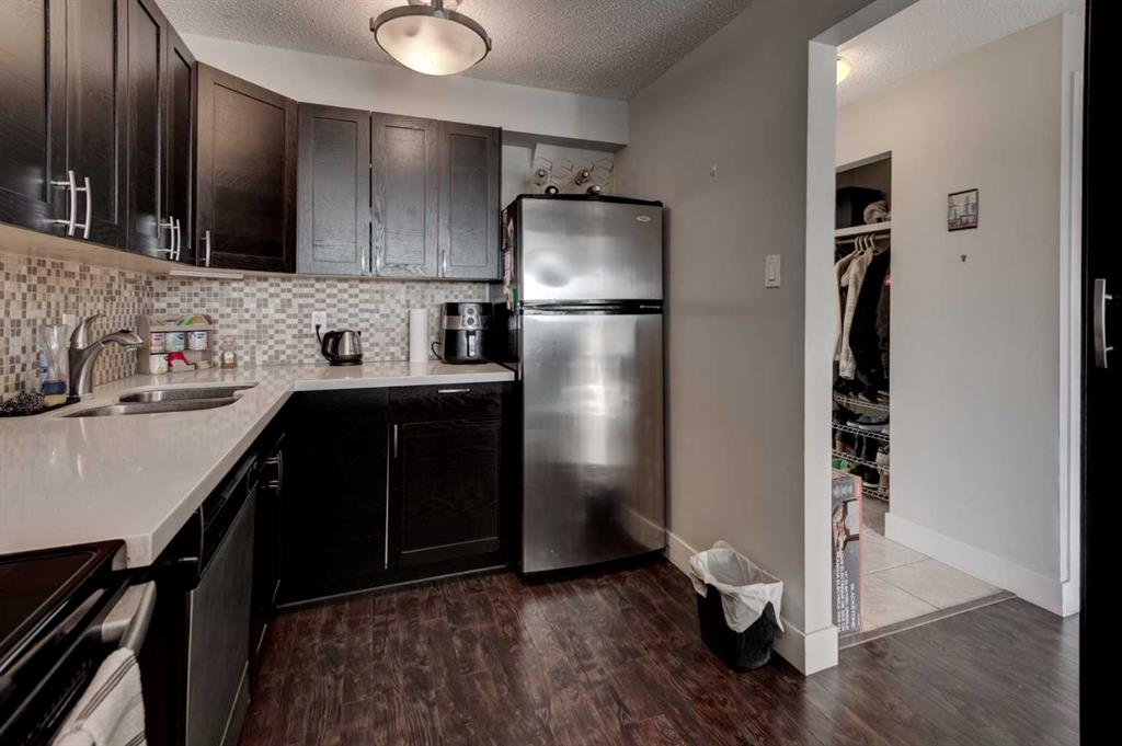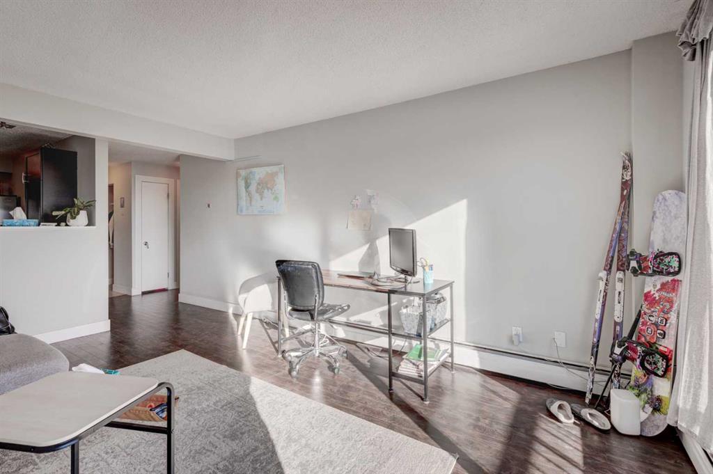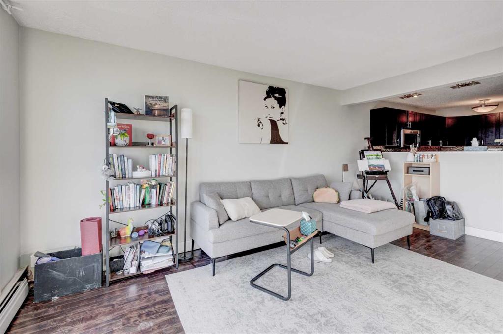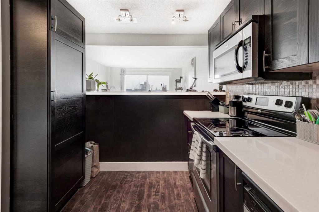 Welcome to this beautifully maintained top-floor end unit in a solid concrete building, offering the perfect blend of style, comfort, and unbeatable convenience, for under $200K. Step inside to discover a bright and functional open-concept floor plan enhanced by dark plank laminate flooring, tile in the entranceway and bathroom, and carpet in the bedroom for added comfort. Modern 4-inch baseboards and casings add a refined finishing touch throughout the home. The stunning kitchen is sure to impress — featuring quartz countertops, stainless steel appliances, a tumble stone backsplash, and an abundance of cabinet space, making it both stylish and highly functional for everyday living or entertaining. Enjoy the convenience of in-suite laundry, plus a sunny south-facing balcony — the perfect spot to relax with your morning coffee or unwind at the end of the day. This well-situated home is just steps from Chinook Centre, and only minutes away from LRT, bus routes, and some of Calgary’s best restaurants. With quick access to major roadways, you can reach downtown, the airport, and the city limits on your way to the mountains in only 15 – 20 minutes. Additional features include assigned parking with plug-in and the added peace and quiet that comes with being a top-floor end unit in a concrete building. Whether you’re a first-time buyer, investor, or downsizer, this home offers incredible value in a great location. Don’t miss your opportunity – book your private showing today.