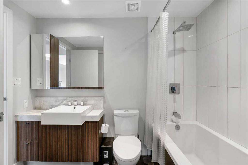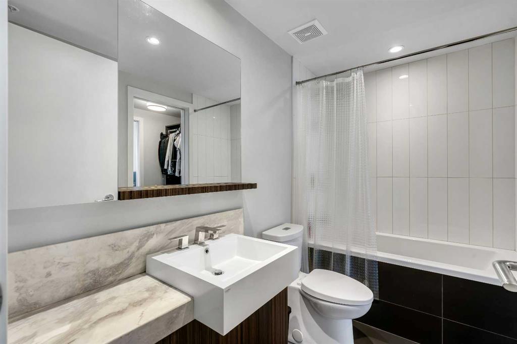 Welcome to Unit 407 in Calla, a beautifully appointed one bedroom plus den in the heart of Calgary’s vibrant Beltline, perfectly positioned next to Lougheed House and just steps from the shops, restaurants, and nightlife of 17th Avenue SW. This stylish condo offers central air conditioning and an upgraded kitchen featuring quartz countertops, full height cabinetry, and modern finishes that blend elegance with everyday functionality. The open concept layout flows seamlessly into the bright living area, complete with durable vinyl plank flooring and large windows that flood the space with natural light. Step out onto the south facing balcony, an ideal spot to enjoy your morning coffee or unwind in the evening. The primary bedroom features a walk through closet that leads to a well appointed four piece cheater ensuite, while the versatile flex space is perfect for a home office or den. Additional highlights include in suite laundry, one titled underground parking stall, and a separate storage locker. Residents of Calla enjoy premium amenities including a well equipped fitness centre, yoga studio, sauna, and guest suite. With elevated finishes, thoughtful design, and an unbeatable inner city location, this home offers the very best of urban living.