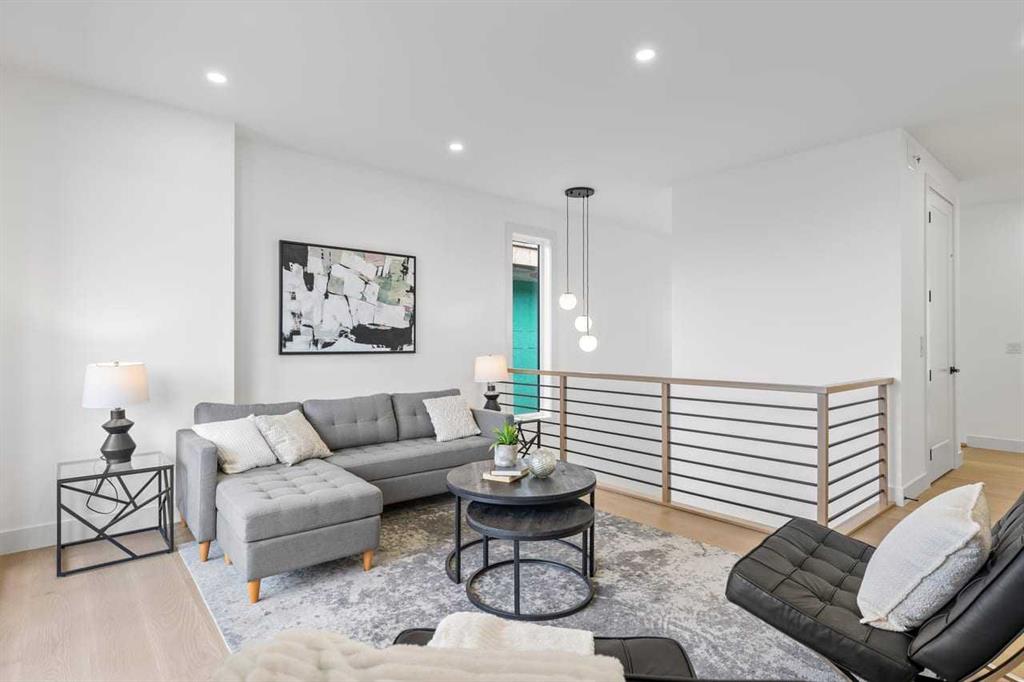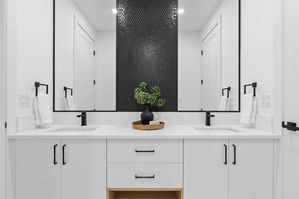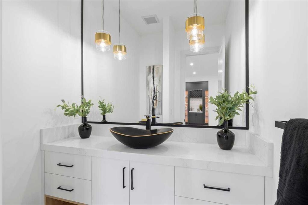 Set within the prestigious community of Patterson Heights – The Point – this exceptional luxury residence offers over 5,000 sq. ft. of elevated living designed for comfort and functionality. From the moment you arrive, the home makes a statement with a grand entryway highlighted by a floor-to-ceiling custom closet. Just off the entrance, a well-appointed mudroom features a walk-in closet and a striking full-height wall unit, providing direct access to the oversized double garage. The garage is fully outfitted with EV charging outlets, a gas heater rough-in, and hot and cold water taps. Completing this level is a full bathroom with quartz countertops and a floor-to-ceiling glass shower. The main living space is defined by 10-foot ceilings and wide vinyl plank flooring, creating a clean, modern flow throughout. The living room offers warmth and style with a custom wall unit and ambient LED lighting, while the dedicated bar area, complete with a bar fridge, is ideal for hosting. A private, light-filled gym with recessed lighting, floating shelving, and generous space for equipment. A striking open-riser staircase and a private elevator connect all 3 levels and lead to the stunning 2nd floor. Here, you’ll find a bright home office overlooking a large window, a sleek powder room, and a refined dining area anchored by a built-in LED-lit wall feature. Glass sliding doors open to a large East facing balcony, while the family room impresses with a coffered ceiling, art-block feature wall, and gas fireplace. Additional sliding doors lead to a fully landscaped backyard complemented by a composite rear deck with a gas line, backing onto peaceful green space, where nature and wildlife create a serene setting. The chef-inspired kitchen anchors the home with a quartz waterfall island, hidden cabinetry, two-tone modern cabinets, and high-end stainless steel appliances. A fully equipped spice kitchen allows for effortless entertaining, while a modern breakfast nook with a statement light fixture completes the space. The upper level is a private sanctuary, beginning with a grand primary suite set behind French doors. Enjoy a private balcony overlooking green space, a juice bar, in-floor heated ensuite, and a spa-style bathroom featuring a freestanding tub and a glass-enclosed steam shower with rainfall head and granite seating. Two additional bedrooms share a Jack & Jill bathroom with quartz countertops, while a fourth bedroom offers its own full bath and walk-in closet. A thoughtfully finished laundry room enhances everyday convenience. A bonus room with downtown views and an additional wall unit completes the upper level, which continues the home’s open feel with 9-foot ceilings throughout. Additional highlights: basement under-slab heating rough-in, a 75-gallon hot water tank, two high-efficiency furnaces, two central A/C units, and extensive built-in cabinetry. Don’t miss the opportunity to own this exceptional luxury home. Book your private showing today!