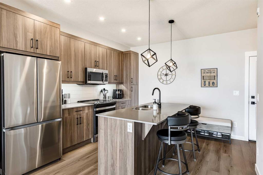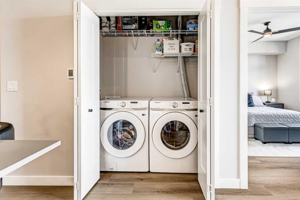 Welcome to this stunning, fully furnished, modern 1-bedroom condo—an ideal space for first-time buyers, savvy investors, or anyone seeking a comfortable, low-maintenance home. Built in 2023, this beautifully designed unit features a spacious bedroom with large windows that flood the space with natural light, complemented by a sleek 4-piece ensuite bathroom. The open-concept kitchen boasts stainless steel appliances, an eat-up island, and flows seamlessly into a bright living area—perfect for relaxing or entertaining guests. Step outside onto your private balcony to enjoy fresh air and scenic views. Additional highlights include in-unit laundry with a full-size washer and dryer, air conditioning, and a convenient half-bathroom for guests. The condo also comes with a titled underground parking stall and a separate storage locker. Located in a quiet, well-maintained complex, this home offers unmatched convenience with quick access to major routes including Stoney Trail, Sarcee Trail, and Shaganappi Trail. You’re just minutes away from schools, public transit, shopping centers, dining options, and key business hubs. Pet-friendly with board approval. This condo blends style, function, and location—making it a perfect place to call home or a valuable addition to your investment portfolio.