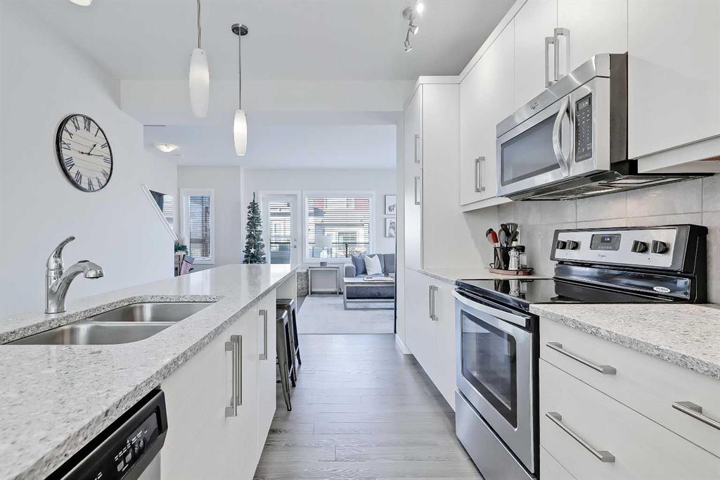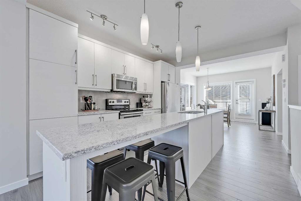 Spanning over 1,715 sq ft of developed living space, this home is bright, airy, and beautifully laid out across three levels, designed for both daily living and entertaining. The main floor features an open-concept design anchored by a sleek white kitchen with full-height cabinetry, stainless steel appliances, and generous quartz countertops. Clean lines, soft neutral tones, and wide-plank flooring create a calm, modern backdrop that feels effortless and inviting. The dining area is perfectly positioned between the kitchen and upper balcony, creating an easy flow for everyday meals and summer entertaining, with space for outdoor dining and BBQs. On the opposite side, the living room is set at the front of the home, offering a bright, open space framed by large windows and an additional private balcony. This separation creates distinct zones for dining and relaxing, while maintaining an airy, connected feel throughout the main level.