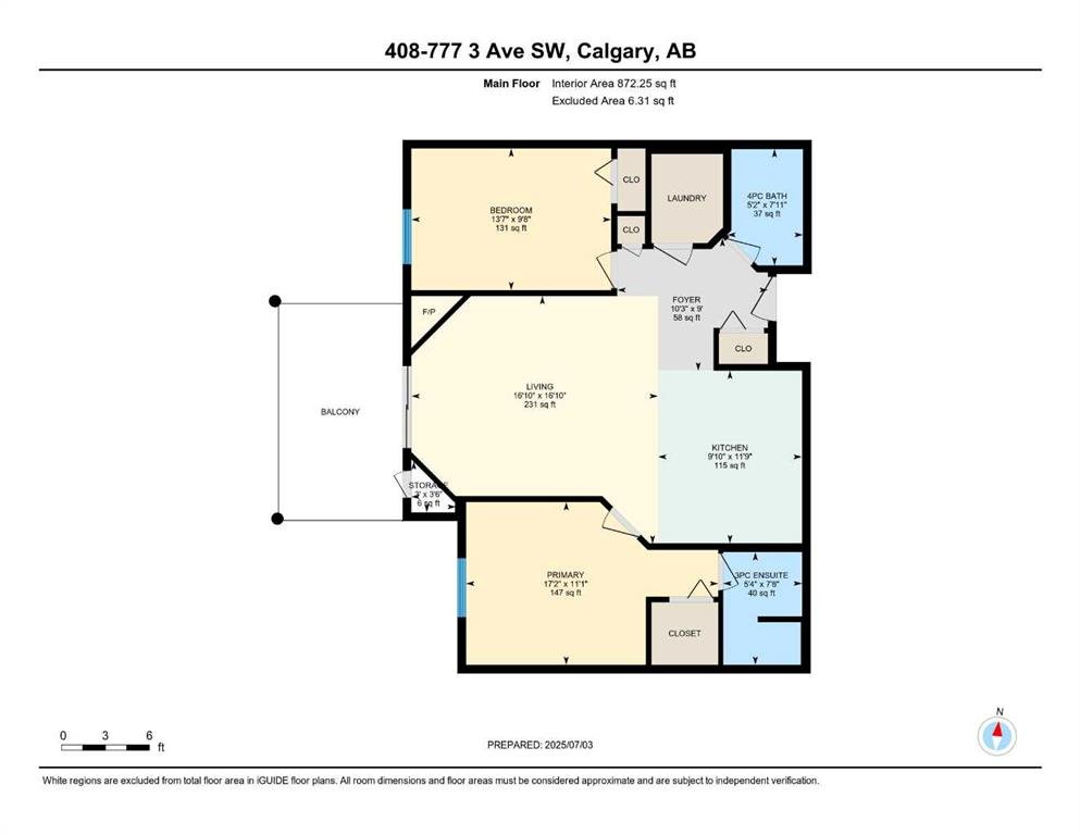 The primary bedroom includes a walk-in closet and private 3-piece ensuite, while the second bedroom is positioned on the opposite side of the unit—ideal for guests, a roommate, or a home office.