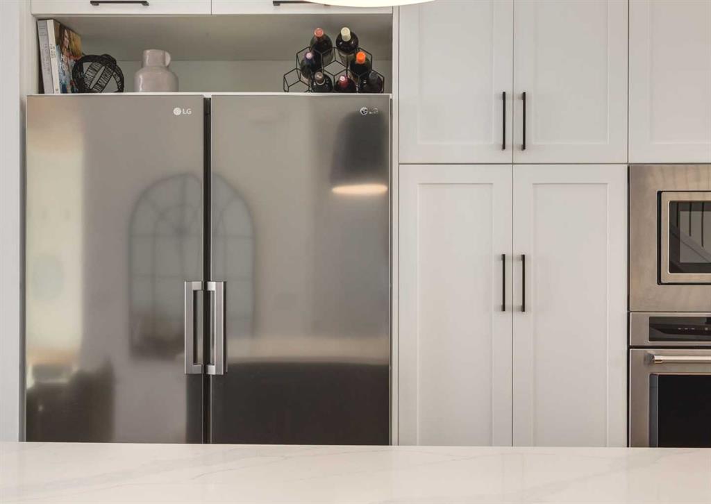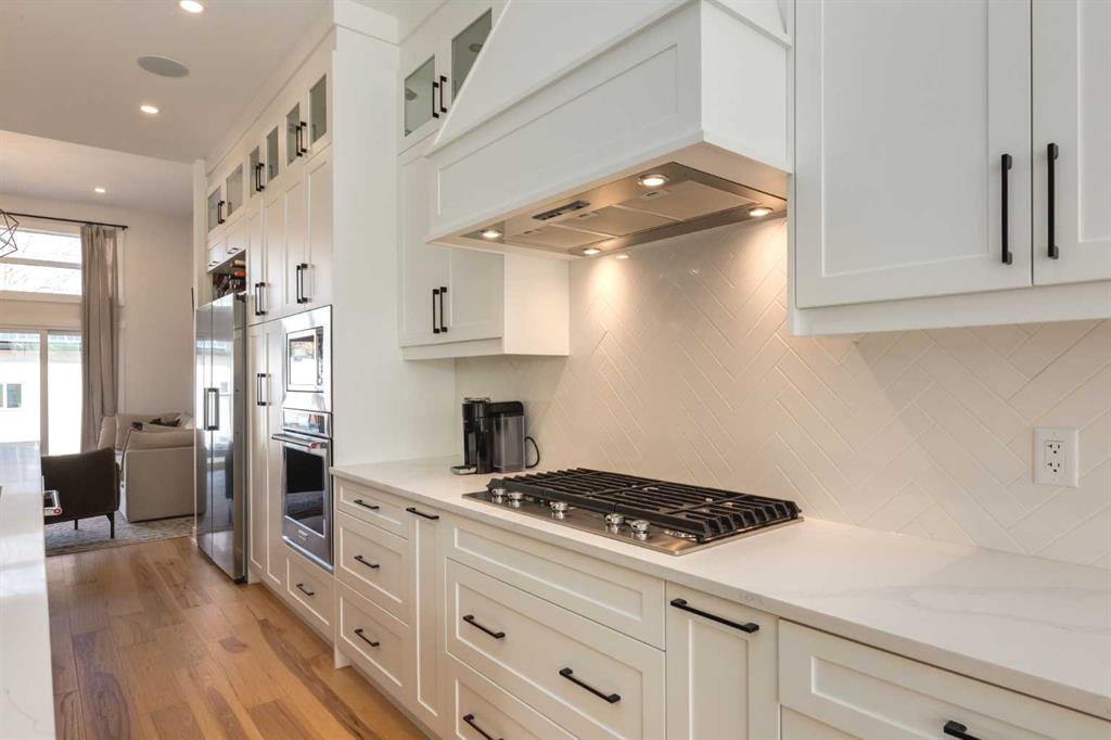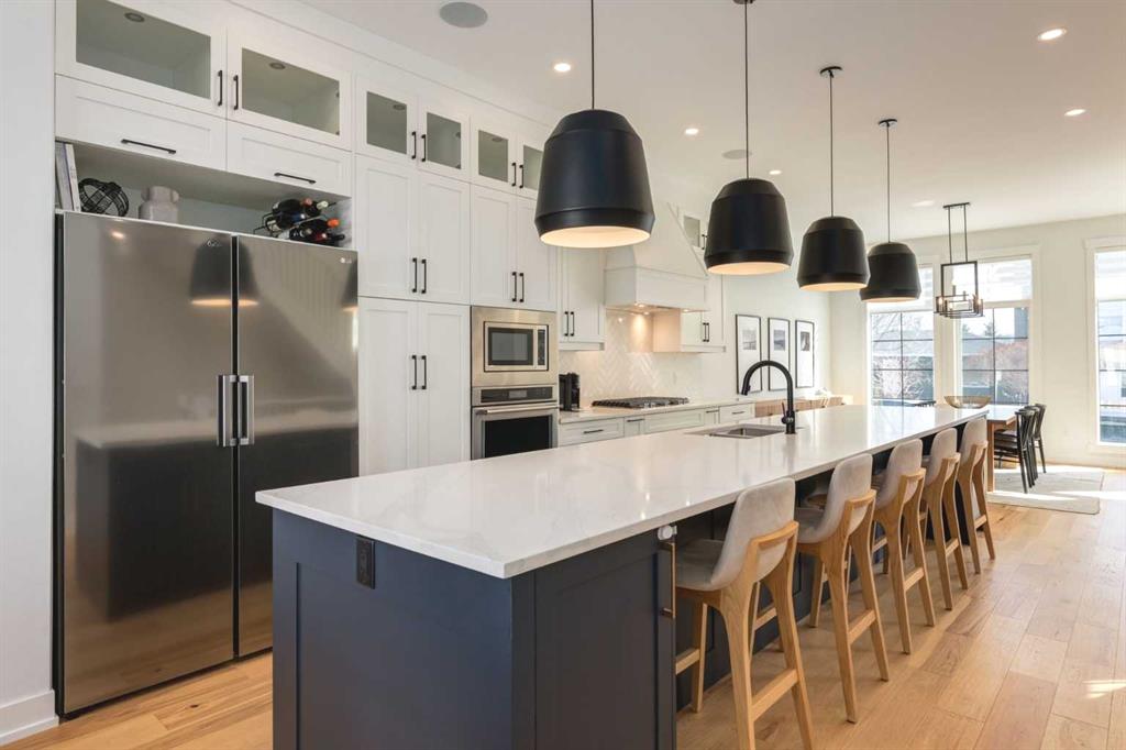 The interior is defined by extraordinary volume, with 10’ and 12’ ceilings on the main floor, 9′ upstairs, and 9’ in the lower level, enhancing the home’s sense of limitless space and light. The kitchen is a masterpiece of design, anchored by a luxurious 16’ quartz island, full-height cabinetry with premium integrated appliances, in-cabinet lighting, a 5-burner gas cooktop, and a 48” side-by-side refrigerator.