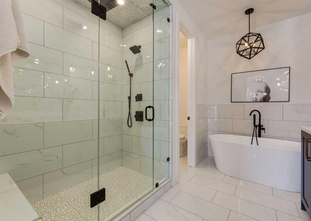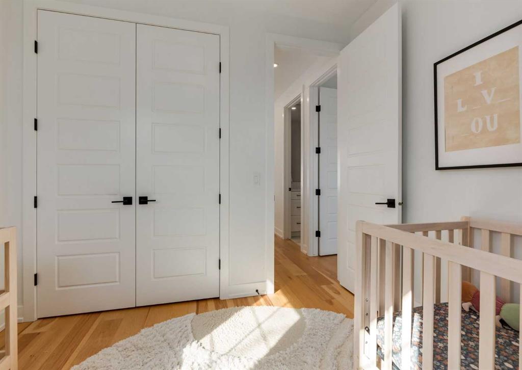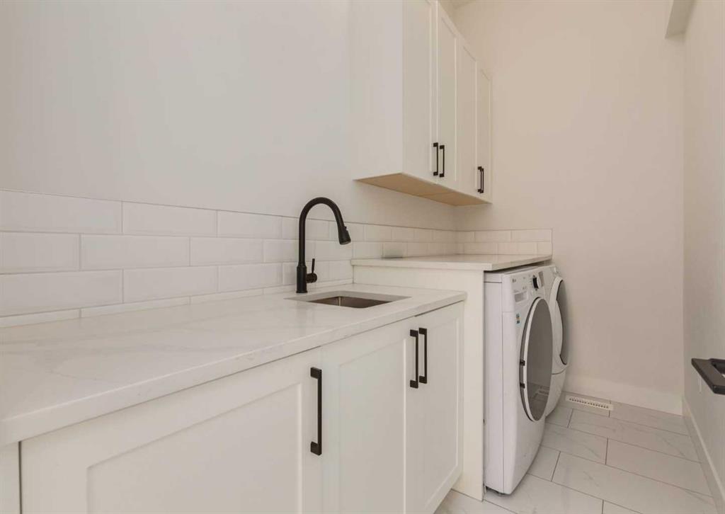 The upper level features three generous bedrooms, including a primary sanctuary with a private Romeo & Juliet balcony, vaulted ceiling, custom built-ins, and a spa-like 5-piece ensuite with heated floors, a deep soaker tub, and a walk-in shower. A dedicated laundry room with side-by-side machines, sink, and folding counter adds daily convenience.