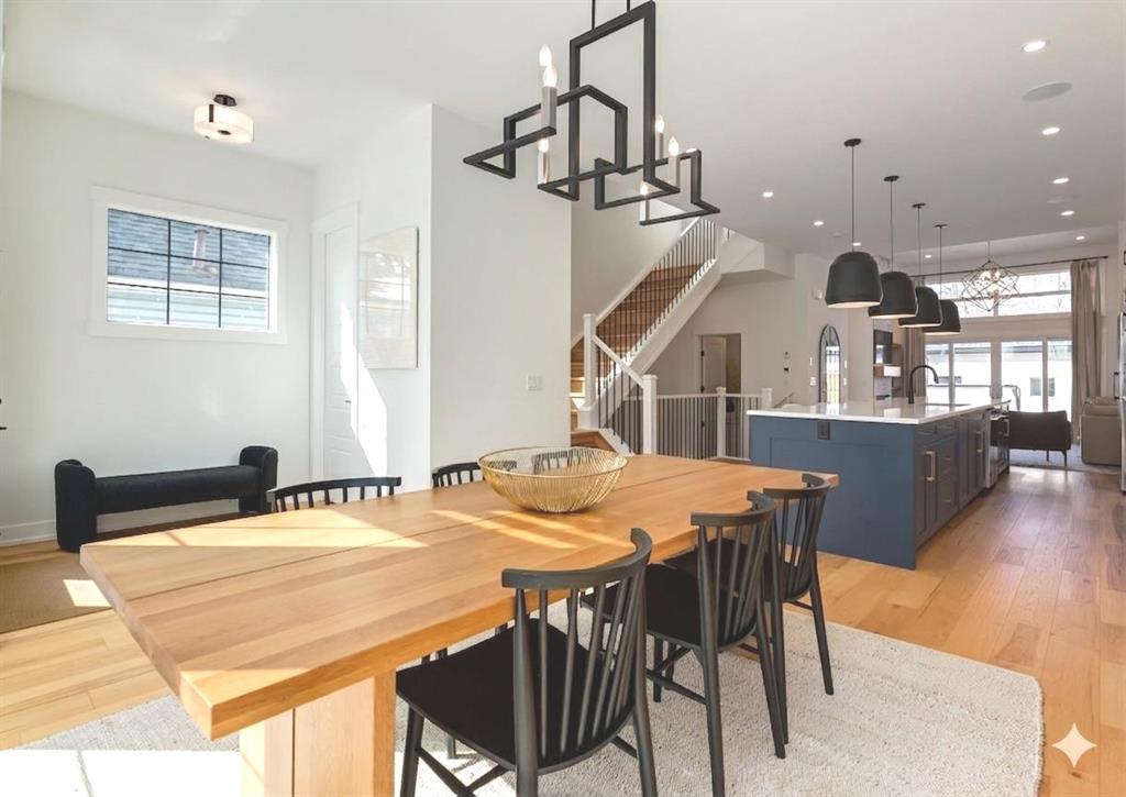 The front dining area overlooks a mature, established street, while the rear living room is defined by expansive 12’ ceilings, a brick fireplace, and rich oak hardwood flooring. Enjoy a seamless transition through sliding doors to your private, landscaped backyard. With a large WEST-FACING deck and a hot tub, this space is perfectly designed for summer evenings and entertaining.