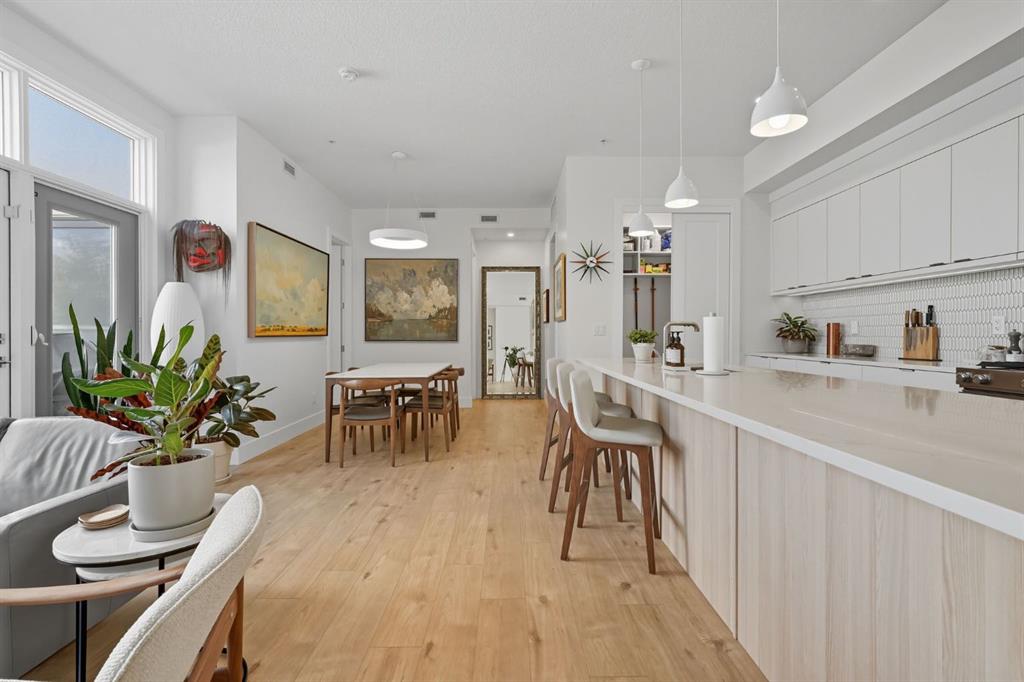 Bright & spacious 3-bed, 3-bath TOP FLOOR CORNER UNIT in this sought-after South Calgary low-rise — offering nearly 1,155 sq ft of living space with 10 FOOT CEILINGS! The heart of this home is the stylish kitchen, beautifully appointed with quartz countertops, sleek cabinetry, stainless steel appliances, a bar fridge and a functional kitchen island with seating.