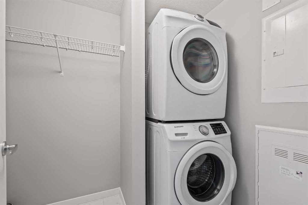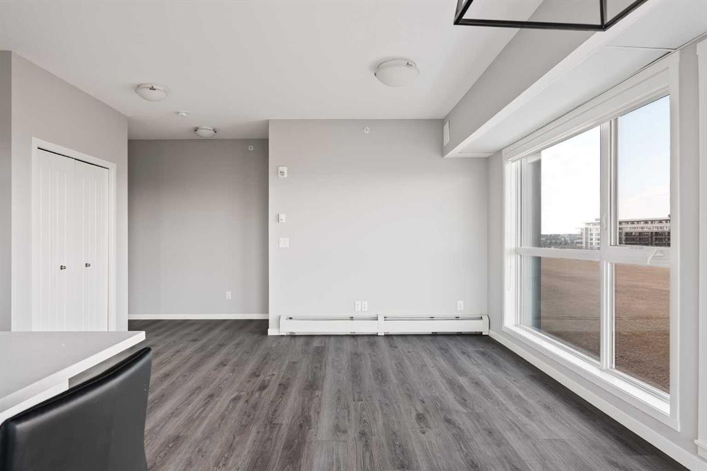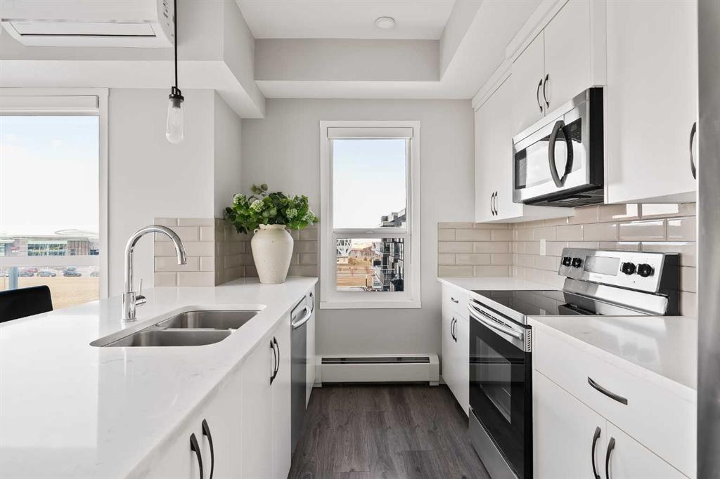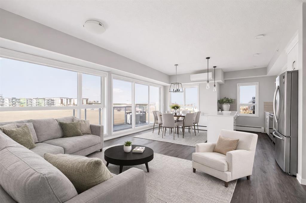 Welcome to Unit 409 at 4350 Seton Drive SE. This beautifully appointed top-floor corner unit has one of the best locations in the building, offering incredible views west, north and east from its private balcony, overlooking the 16-acre park. Located in the heart of the vibrant Seton Urban District, this move-in ready condo features nearly 850 sq. ft. of thoughtfully designed living space. This sun-drenched corner unit features 2 bedrooms and 2 bathrooms, delivering the perfect blend of comfort, style, and low-maintenance living. Step inside to discover a bright and airy open-concept layout, where oversized windows flood the home with natural light from every angle. Designed with both everyday living and entertaining in mind, the seamless flow between the kitchen, dining, and living areas creates an inviting and functional space. The modern kitchen offers timeless white cabinetry, a large peninsula with additional seating, quartz countertops and full-height cabinets, making it as practical as it is stylish. The primary bedroom serves as a private retreat, complete with its own double sided walkthrough closet and private ensuite featuring a walk-in shower. The second bedroom is on the opposite side of the unit, maximizing privacy while providing flexibility for guests, a home office, or additional living space. A second full bathroom ensures added convenience for both residents and visitors. Additional highlights include air conditioning for year-round comfort and a spacious in-suite laundry room that makes daily living effortless. Step outside onto your private balcony – the perfect spot for morning coffee, evening drinks, or summer BBQs – all while enjoying elevated views from this top-floor unit overlooking the 16 acre park. This home also includes a Titled secure underground parking stall, a dedicated storage locker, and access to a bike room, offering both convenience and peace of mind. Located in one of Calgary’s most dynamic communities, you’re just a short walk from the Seton YMCA, South Health Campus, and a wide variety of shopping, dining, and entertainment options, including Cineplex and everyday essentials. Combining location, lifestyle, and modern design, this is condo living at its finest. This unit offers the perfect opportunity for first time buyers, investors, or those looking to downsize without compromise. With no neighbours above you, and incredible year-round views, this top-floor unit provides maintenance-free single level living at an affordable price, just steps from countless amenities.