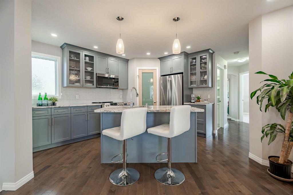Good morning Beautiful! Nestled on a quiet street within walking distance to schools, parks, and playgrounds, this extensively renovated and meticulously maintained, modified, bi-level showcases a seamless, well-planned layout and offers approximately 2,120 sq.ft of thoughtful design. Featuring a professionally finished lower level, soaring ceilings, and a sunny south-facing backyard, this home perfectly blends comfort and style. As you enter, the front great room immediately impresses with 12′ ceilings, floor-to-ceiling windows, an open and airy feel, and a stunning crystal fandelier that creates an elegant focal point while maintaining warmth and comfort for everyday living. The upper level features a bright and functional layout with a fully renovated kitchen(2022), custom full-height cabinetry, granite countertops, stainless steel appliances, LED pot lights with dimmers, pendant lighting over the island, and a frosted glass pantry door, all flowing seamlessly into the adjoining dining room. Two generously sized bedrooms and a beautifully renovated bathroom(2022) with porcelain tile flooring, a glass and porcelain tiled shower with niche and sliding glass door, quartz countertops, custom cabinetry, and updated lighting complete this level, along with a convenient main floor laundry area equipped with a newer (2022) front-load washer with steam, dryer, and folding counter. The bright lower level features large windows that fill the spacious family room with abundant natural light, complemented by a cozy corner gas fireplace. This level also includes a generous guest bedroom, a beautifully renovated (2022), four-piece bathroom with porcelain tile and quartz countertops, and an oversized under-stair storage area. And there’s more… Additional renovations completed in 2022 include fresh interior paint, new trim, updated knockdown ceiling texture, and new carpet in the lower level and bedrooms—creating a cohesive, modern feel throughout the home. Outside, enjoy the underground sprinklers with 3 zones, fenced south-facing backyard with partially covered upper deck, a poured concrete patio and front walkway (2022), while additional upgrades include hail-resistant shingles (2025), new siding on the west facade of the house (2025), and an oversized, insulated & drywalled, double detached garage. Located just minutes from parks & playgrounds, schools, shopping, transit, Stoney Trail, and Deerfoot access, this beautifully renovated, move-in ready home combines quality finishes, functional design, and an exceptional location.