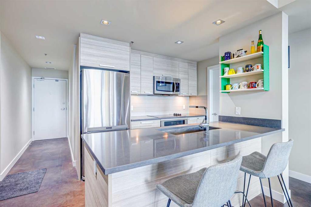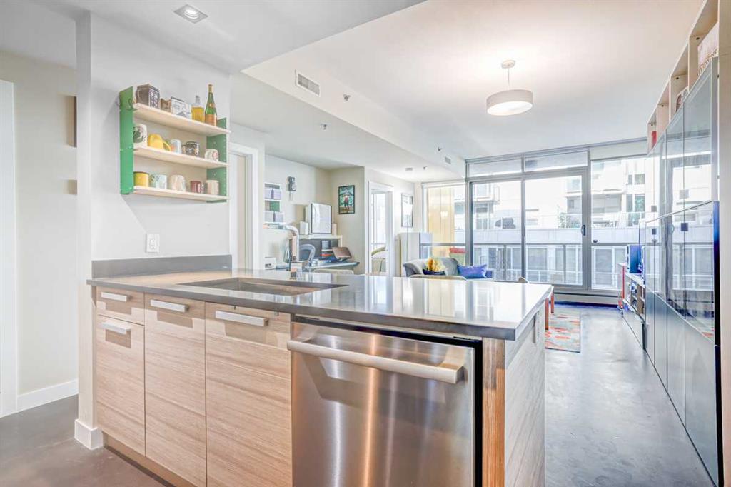 Contemporary comfort and exceptional inner-city convenience come together in this west-facing 1 bedroom + den unit in Pixel by Battistella, ideally positioned in the heart of Sunnyside. Pride of ownership is evident throughout as this original owner home has been meticulously maintained, offering both style and functionality in a highly walkable location. Polished concrete flooring introduces a contemporary aesthetic while delivering durability and low-maintenance everyday living. An open concept layout creates natural flow between spaces, centred around a dining area that connects seamlessly to both kitchen and living zones. Culinary creativity is supported by a well-appointed kitchen featuring quartz countertops, full-height cabinetry, stainless steel appliances and a peninsula island that encourages casual dining and conversation. An expansive built-in workstation provides exceptional flexibility for working from home, creative pursuits or organized daily living, offering more surface area than typically found in comparable units. Floor-to-ceiling windows span the living room, drawing in natural light throughout the day while creating a seamless transition to the full-width west-facing balcony complete with a gas line for barbeques and space to unwind outdoors. A larger primary bedroom easily accommodates a king-sized bed while oversized windows enhance both light and comfort. Dual walk-through closets enable excellent storage and connect directly to the 4-piece bathroom for added convenience. A versatile den delivers additional flexibility for a home office, hobby space or extra storage depending on your needs. Comfort is elevated with 2 wall-mounted air conditioning units, one in the living room and one in the bedroom, ensuring a cool retreat during warmer months. In-suite laundry adds everyday ease while titled parking and an exceptionally large titled storage locker on P2, one of only 2 of its size in the building, provide rare and valuable additional space. Residents enjoy access to a stunning rooftop terrace designed for connection and relaxation, complete with fireplaces, lounge areas and panoramic views of the city skyline and Bow River. A pet-friendly building further enhances lifestyle flexibility. Daily life unfolds effortlessly with Safeway and the LRT station just 1 block away, while Kensington’s shops, restaurants and cafes are moments from your door. Pathways along the Bow River and Prince’s Island Park invite outdoor recreation while the downtown core remains within easy walking distance, supporting a vibrant and connected urban lifestyle. Truly an exceptional home in an unbeatable, extremely walkable location!