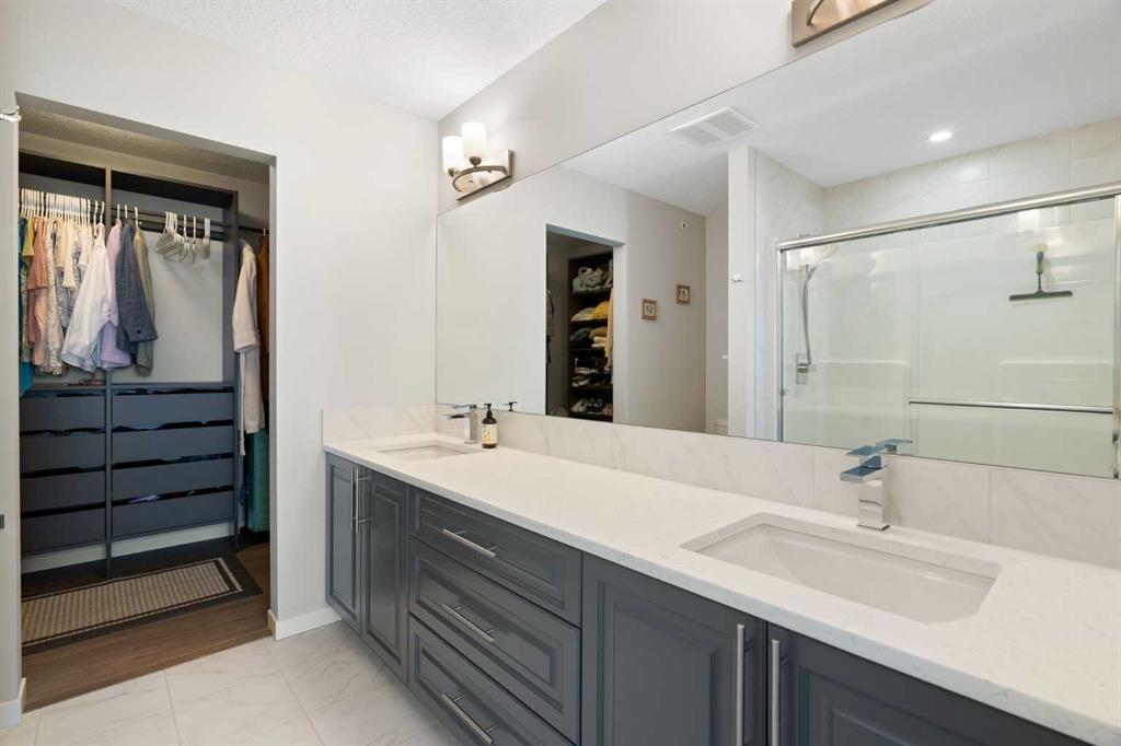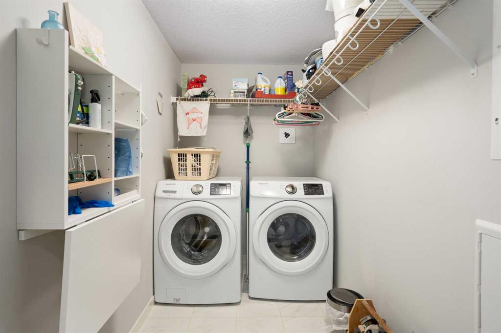 The primary suite is a private retreat, complete with a walk-in closet, direct balcony access, and a beautifully appointed ensuite showcasing dual sinks, quartz counters, and a walk-in shower. Two additional bedrooms share a stylish 4-piece bathroom, while the generously sized laundry room offers excellent additional storage.