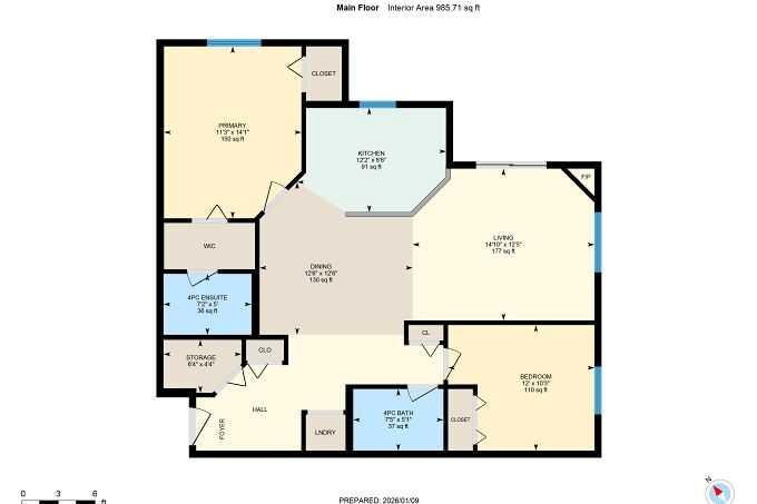 The primary bedroom features a walkthrough closet leading to a 4-piece ensuite, while the second bedroom is generously sized and ideal for guests or a home office. A second 4-piece bathroom, in-suite laundry, and a separate storage room complete the unit.