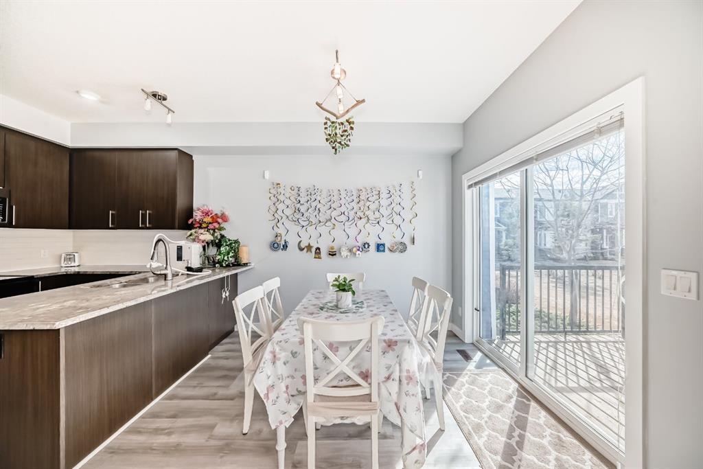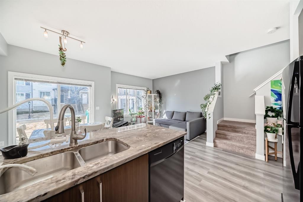 Beautifully maintained 2-storey townhouse condo built in 2013, offering 3 bedrooms, 3 bathrooms, and a front-attached garage. The open-concept main floor features a modern kitchen with stone countertops, black appliances, and a bright living and dining area.