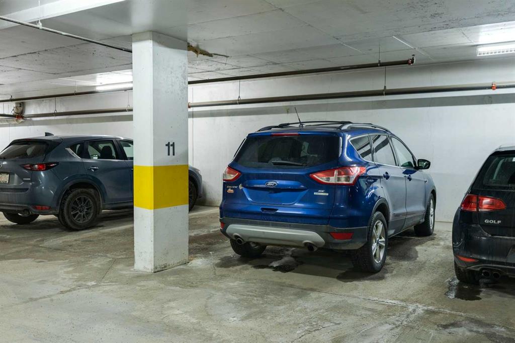 Welcome to Stonecroft Highland Park. Situated on the top floor this single bedroom + den unit features 15ft vaulted ceilings providing a ton of natural light – rare for apartment style condos. Combined with large windows, the height and design create an open, light-filled space that immediately stands out. The functional layout offers thoughtfully designed living throughout. The chefs style kitchen provides excellent cabinet and counter space, complete with granite countertops, stainless steel appliances, and a functional breakfast bar. The primary bedroom is spacious and bright, with large windows and his and hers closets for added storage and organization. A generous 4 piece bathroom and versatile den offer flexibility for a home office, guest area, or additional living space. Additional features include a stacked in-suite washer and dryer, private patio, heated underground parking stall, and separate storage locker. Overall this unit shows pride of ownership throughout! Condo fees include heat and water. The building is well cared for and offers a social room and lots of covered visitor parking. Located on a quiet street next to an off-leash dog park, it provides convenient access to Deerfoot Trail, Centre Street, nearby shops, amenities, and downtown by public transit. An excellent opportunity for comfortable living in a desirable and convenient location. Top floor units in this building don’t last long so be sure to schedule your tour before its gone!