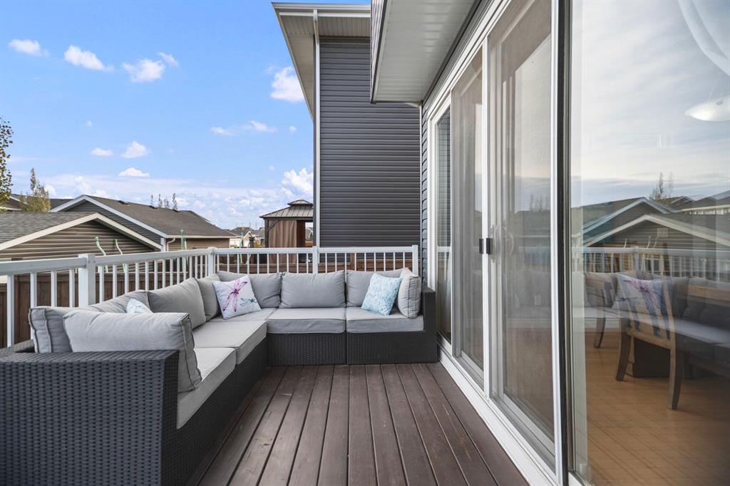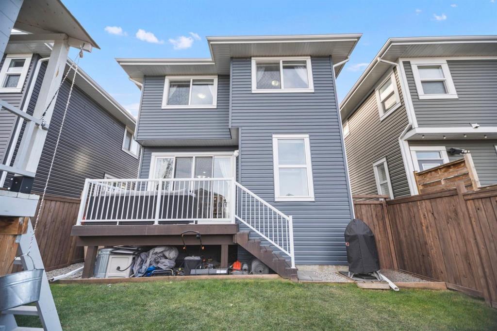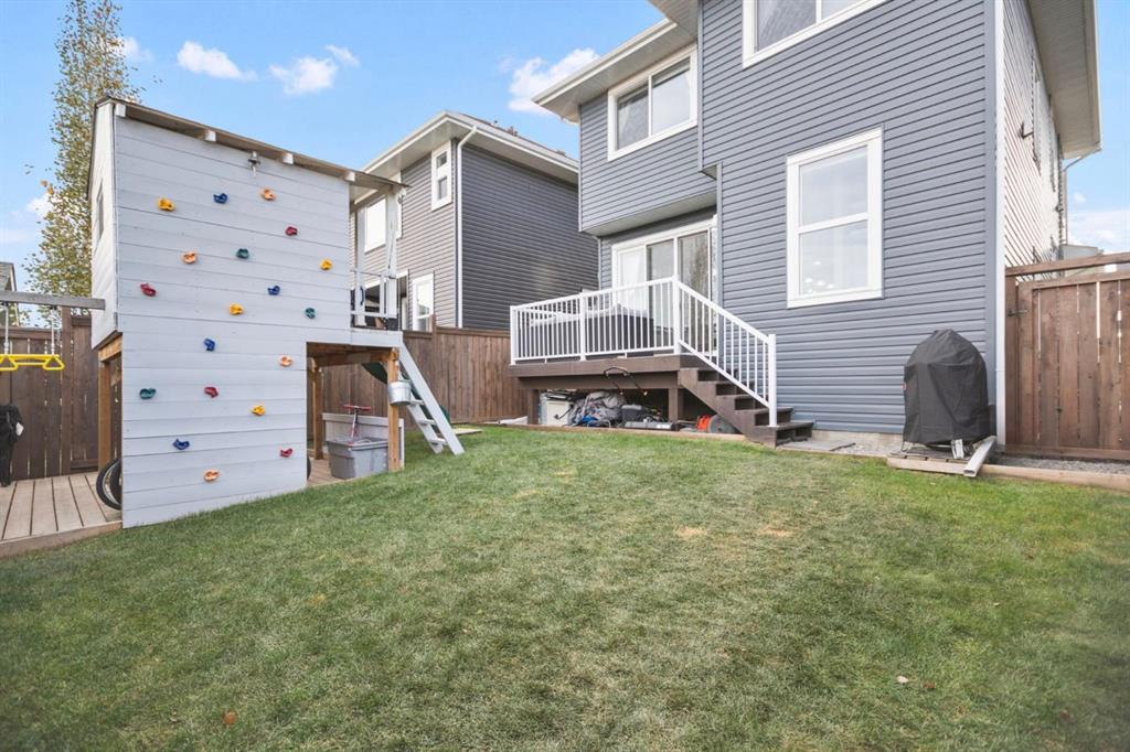 Welcome to 411 River Heights Crescent, a beautifully appointed home where timeless design meets modern sustainability. Thoughtfully designed with high ceilings, expansive windows, and a naturally flowing floor plan, this residence offers a perfect blend of light, space, and comfort. The main level features a bright and open living area anchored by a striking stone-surround gas fireplace and framed by large south-facing windows. The elegant kitchen is a true centerpiece showcasing timeless white cabinetry, a farmhouse sink, quartz countertops, hidden microwave, and a large uninterrupted island ideal for baking, entertaining, or family meals. Hardwood floating shelves add warmth and charm, while a 3rd rack dishwasher and spacious pantry enhance everyday functionality. Upstairs, the primary suite is a tranquil retreat with oversized windows, a large walk-in closet, and a spa-inspired ensuite with large vanity with generous storage, and a relaxing corner tub. Two additional bedrooms and a full bathroom with a large vanity complete the upper level. The fully developed basement extends the living space with a large, versatile recreation area perfect for hobbies, fitness, or family movie nights along with an additional bedroom and tons of storage space. This home stands apart with its professionally installed 7.36 kW Net Zero Solar System, designed for peak efficiency and long-term savings – generating over 40,900 kWh of energy in its first 5 years. Over its lifetime it will offset 151,000 lbs of coal; this system delivers near net-zero electricity costs averaging under $100/month for a family of six. Environmentally, it’s equivalent to planting 3,600+ trees or removing a vehicle from the road each year. Outside, the beautifully landscaped yard features raised garden beds, established perennials, and both north- and south-facing outdoor living spaces, a sunny front veranda and a private back deck off the dining room that has double sliding doors to extend the space naturally for summer gatherings. It has a great size yard with a playhouse for the kids to enjoy. Located in a quiet, low-traffic section of River Heights Crescent, this home offers quick access to parks, playgrounds, schools, and walking paths, with easy routes to downtown Cochrane and Calgary. It’s a rare opportunity to enjoy timeless craftsmanship, a smart layout, and modern energy independence all in one remarkable home.