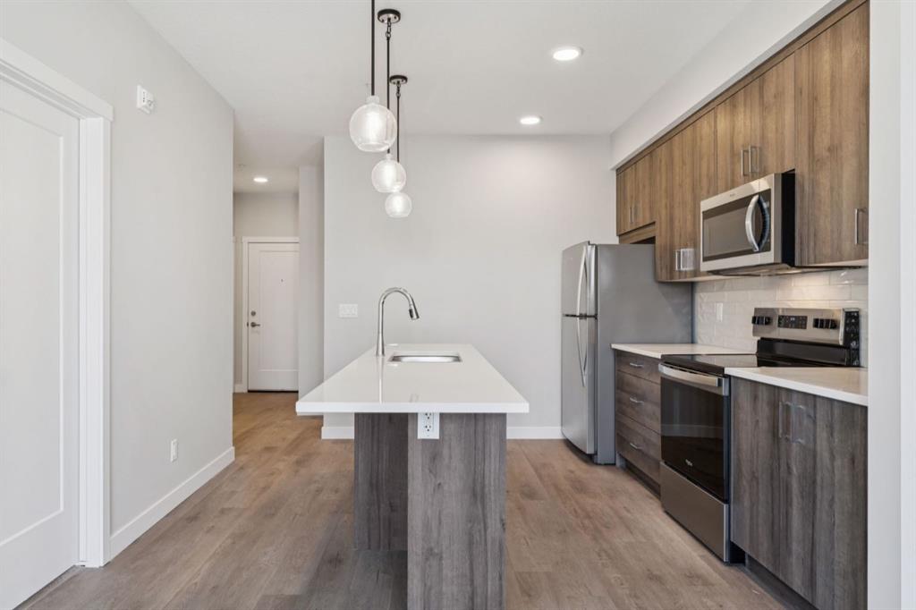 Modern 2-Bedroom Condo in Fish Creek Exchange Welcome to this brand-new 2-bedroom, 2-bathroom home in the 2025 Fish Creek Exchange development, located in the sought-after community of Shawnee Slopes. Offering 732 sq ft (builder size), this thoughtfully designed condo features high ceilings, luxury vinyl plank flooring, and a stylish kitchen complete with quartz countertops, stainless steel appliances, and full-height cabinetry. The open-concept layout extends to a private west-facing balcony, perfect for enjoying morning coffee, summer evenings, or a breath of fresh air with the best Calgary Sunsets. Convenience is built in with titled underground parking and a secure titled storage cage. Just steps from the Fish Creek–Lacombe LRT Station and minutes from the trails of Fish Creek Provincial Park, this home combines modern living with easy access to nature, transit, and nearby amenities.