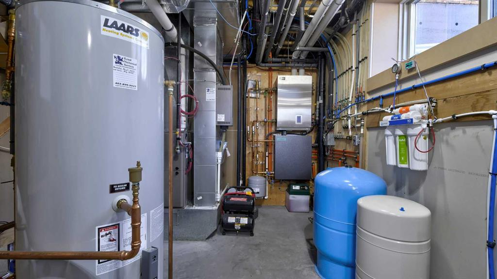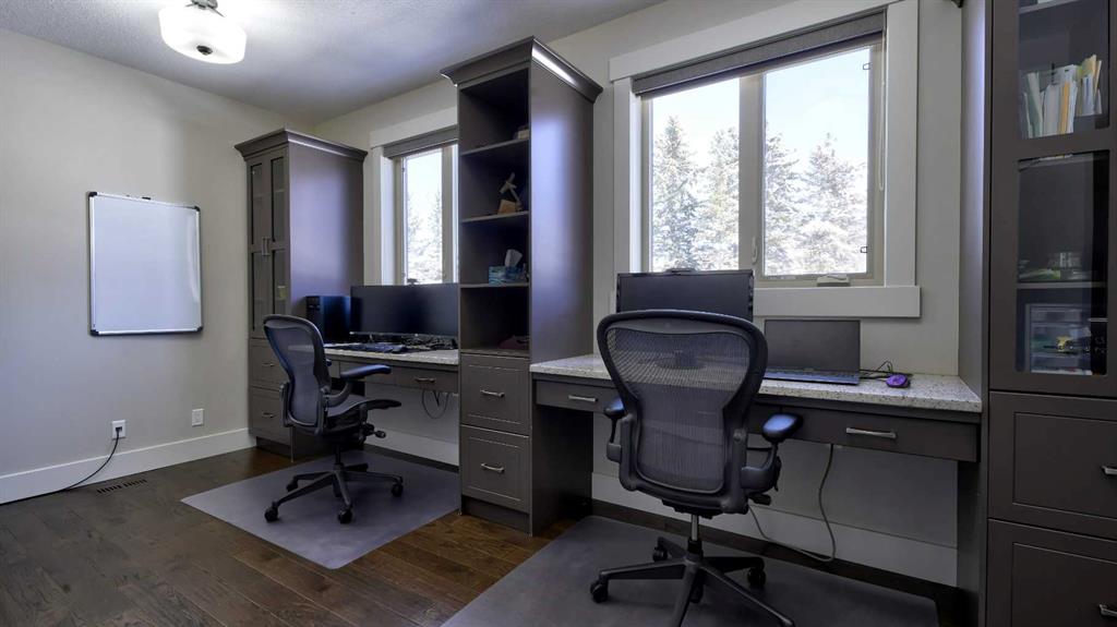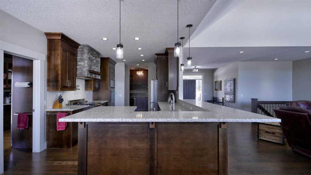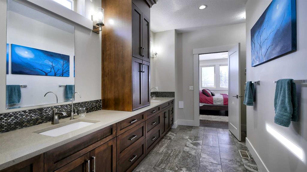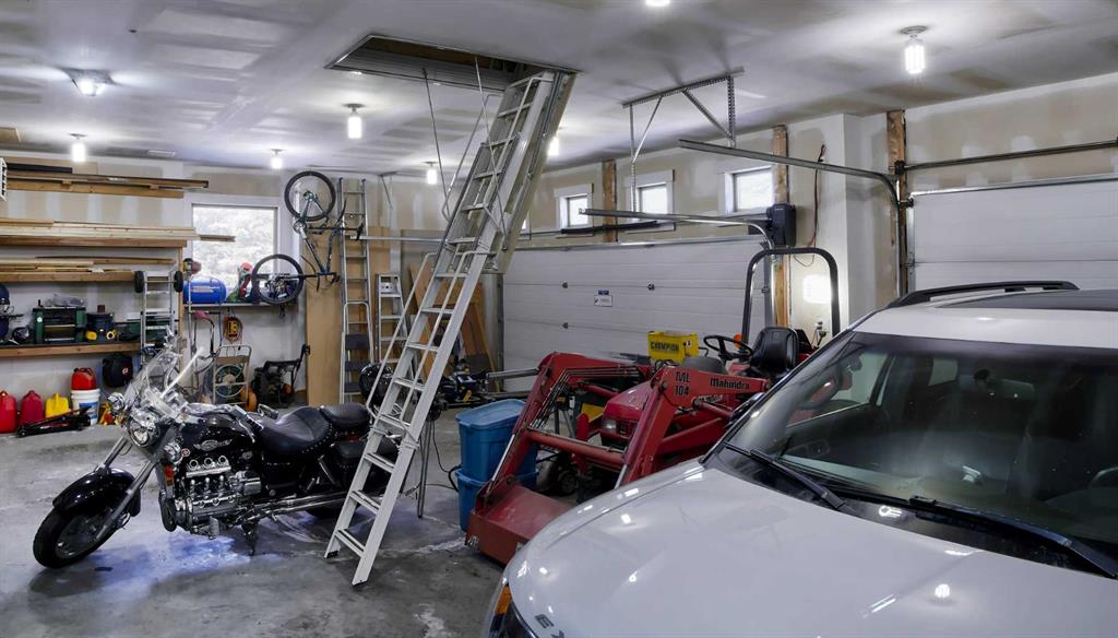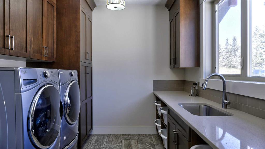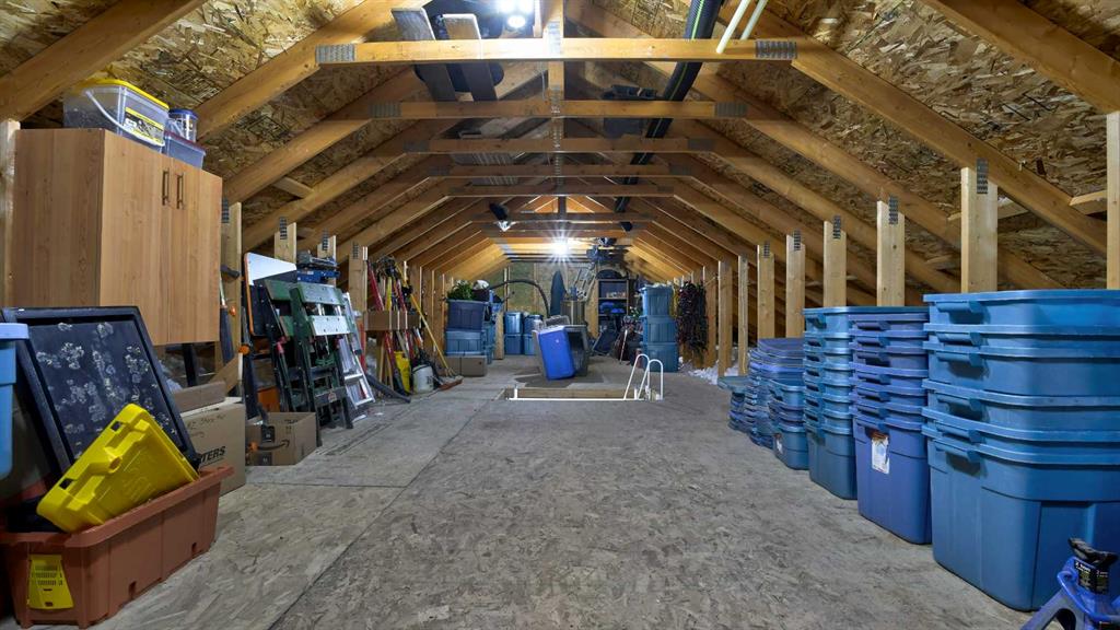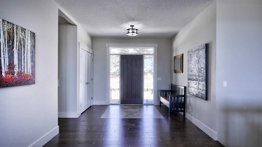 Rocky Mountains. Your custom designed estate home, built in 2019, is nestled amongst mature trees and rolling hills in one of the most unique parcels in Springbank. Reside in a subdivision of just 3 homes surrounded by active ranching and farmland. The oversized quad garage has a heated floor to provide gentle radiant warmth, a raised dog wash, stainless steel utility sink, cabinets, shelving and a huge workbench. A true mancave, ready for you to restore a classic car or tackle all those weekend projects. A unique attic truss system virtually doubles garage storage space, giving you a safe and secure place to keep