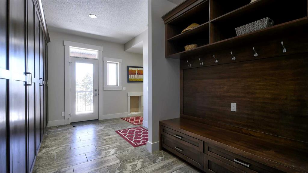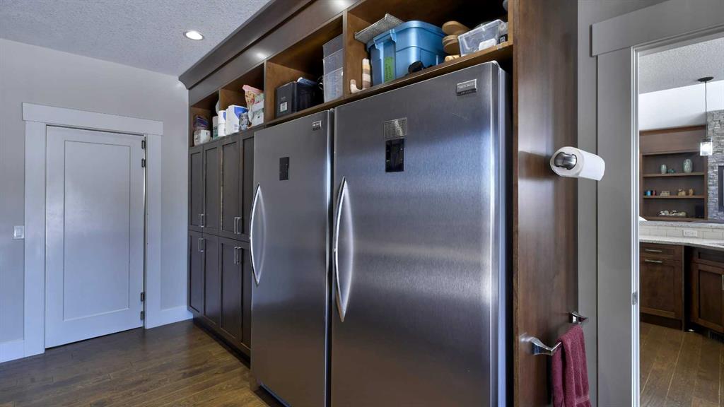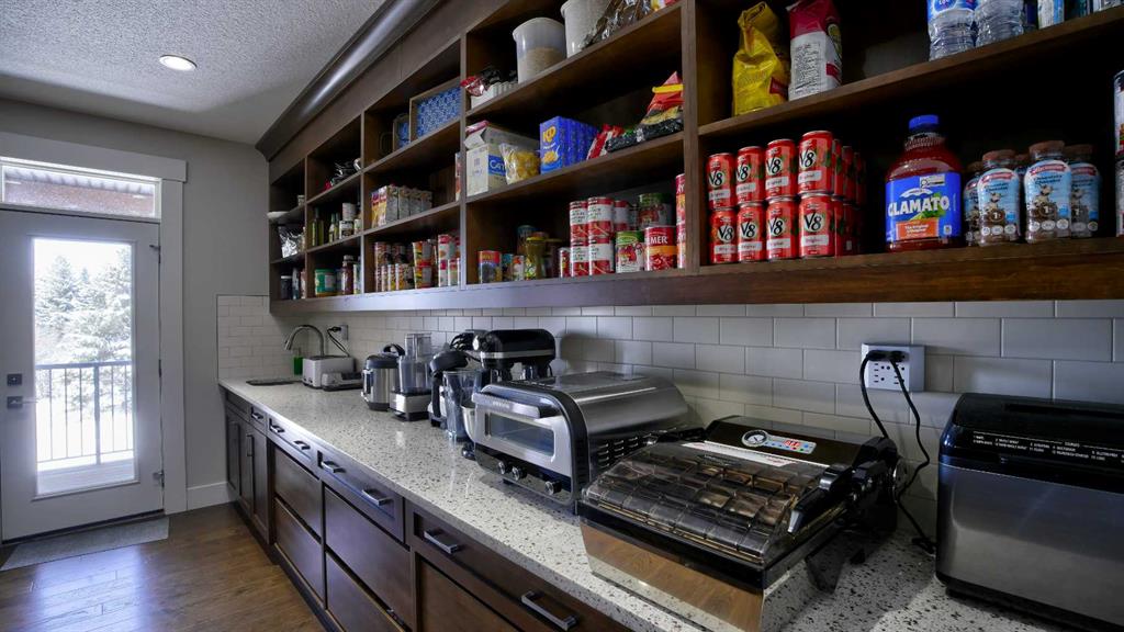 your skis, kids hockey equipment and so much more. In the mudroom admire the built in seating and four oversized custom closets, a roomy and perfect place to bundle up the kids before heading out. A massive walk in pantry with full size dedicated fridge and freezer, wall to wall custom crafted cupboards and quartz counter tops stands ready to hold all