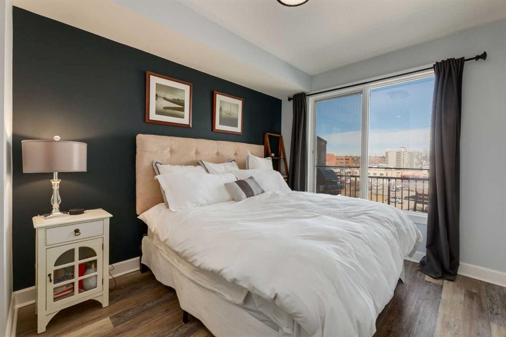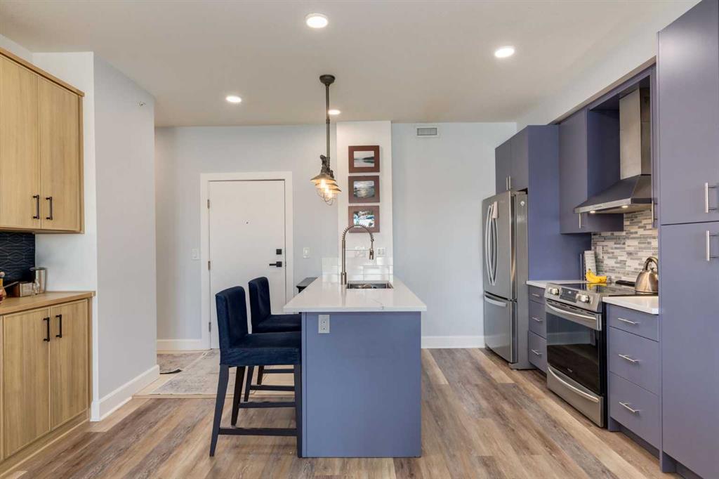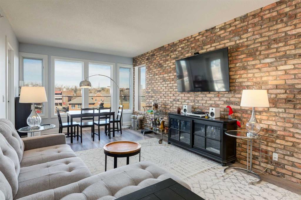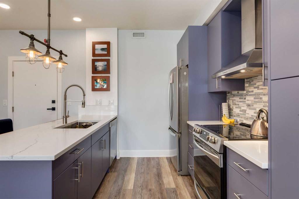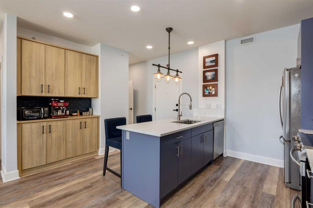 Welcome to Kensington living at its finest in The Providence Condo. This beautifully maintained building offers secure underground titled parking, storage, and a fully equipped fitness facility, all in one of Calgary’s most walkable and vibrant inner-city communities. Perched on the top floor, this fully renovated 2-bedroom, 2-bathroom residence showcases a bright contemporary design with refined industrial character. Thoughtfully curated finishes include Edison-style pendant lighting, a striking Chicago brick feature wall, wide plank luxury vinyl flooring, and a custom built coffee bar, that adds both style and function. The open-concept kitchen makes a bold statement with rich navy cabinetry, stainless steel appliances, quartz countertops, and classic subway tile backsplash—perfectly designed for everyday living and entertaining alike. Both bedrooms and the private balcony capture impressive views toward Kensington and Southern Alberta Institute of Technology, while the spacious primary retreat features a walk-through closet with storage space designed and installed by California Closets, leading to a beautifully updated ensuite complete with vessel sinks and elevated finishes. The 2nd bedroom has also had the California Closet treatment, because we know how important storage spaces are! Just steps from trendy restaurants, cafés, groceries, transit, and the pathways along the Bow River, this home delivers the ultimate urban lifestyle in one of Calgary’s most sought-after neighbourhoods