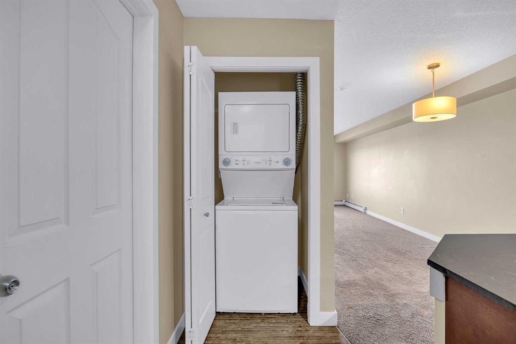 This bright top 4th-floor condo offers 507 sq. ft. of functional living space, conveniently located close to the elevator. The unit features a carpeted bedroom (8’11” × 11’4”) that fits a double size bed with side tables, a spacious living room, and a four-piece bathroom with a granite countertop sink. The kitchen boasts a granite breakfast countertop, double sink, stove, microwave, dishwasher, and a brand new fridge,. Additional highlights include a brand new in-suite washer and dryer and one titled underground parking stall (#463).