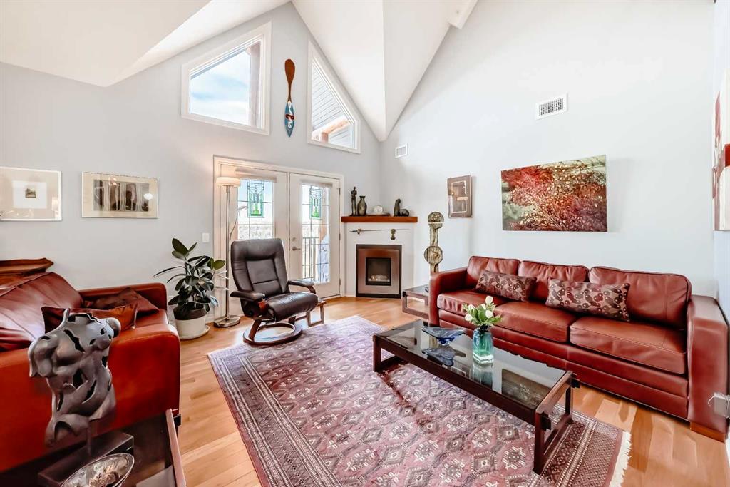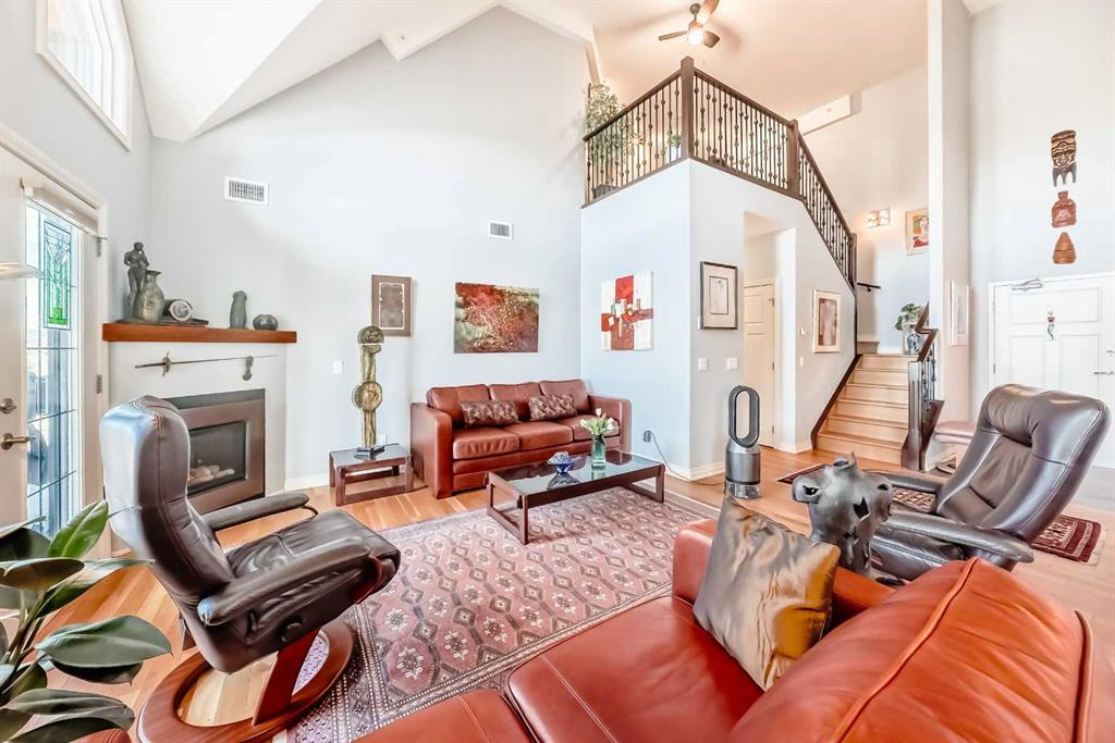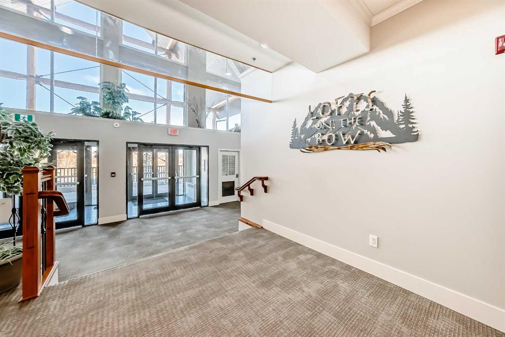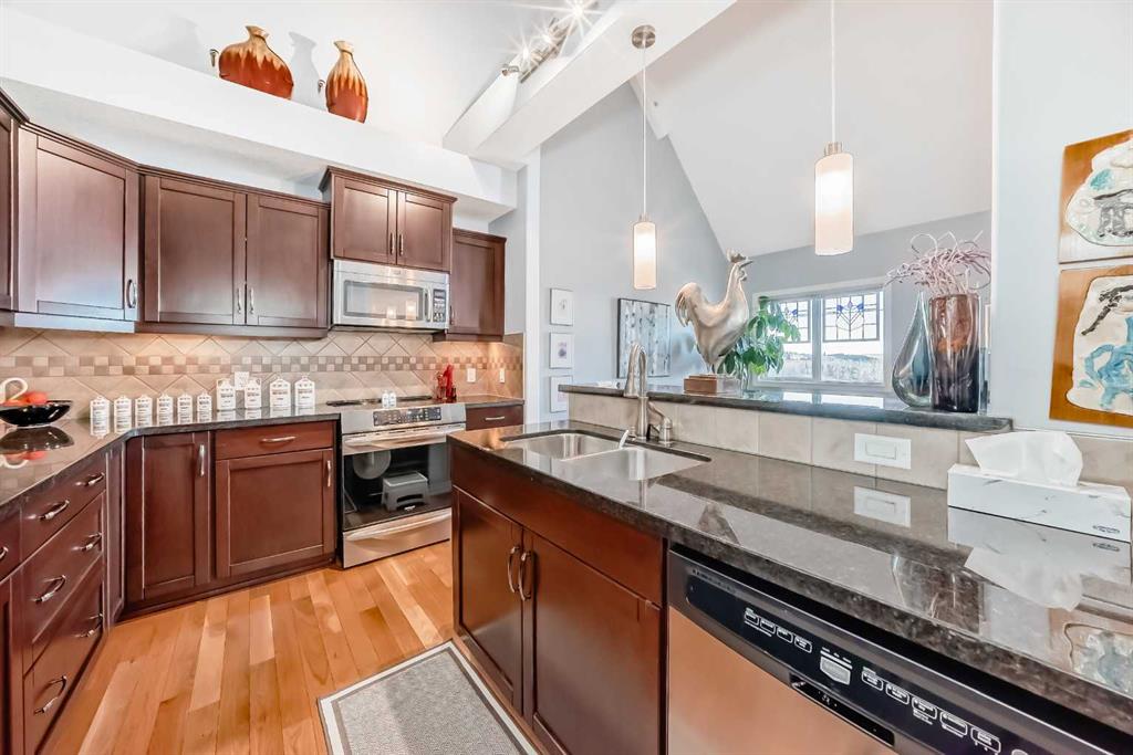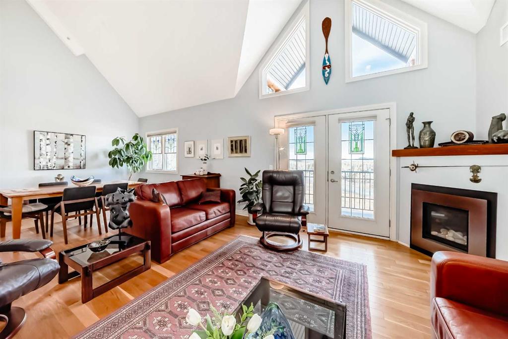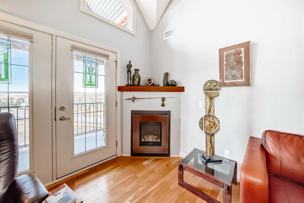 TOP FLOOR ~ WEST Facing with Mountain View~ Incredibly well taken care of with classic style. This 1 bedroom 2 bath condo with LOFT is beautiful. The additions added throughout the years make it simply stylish from the Hardwood Flooring throughout, Refaced Gas Fireplace, ( one of only two in the entire building) and classic paint colour. As you enter notice the Soaring Vaulted ceilings with windows that let in so much light, Tastefully designed kitchen with SS appliances, Breakfast Bar and a perfect cooking space. Ample dining area with the sit up breakfast bar makes for a great entertaining space. The living room with gas fireplace, and garden doors to the west facing balcony is a wonderful size. Up the stairs to the LOFT adds more living space for whatever you desire ~ TV room, Office, Guest bedroom, Library…… Back down the hall there is a closet, 4 piece main bath, and the Master Bedroom with walk through closet and 5 piece en suite. Love this tub shower combo. Heading out the garden doors to the deck there is a gas line for a BBQ and storage room which has been drywalled and wired with a light and plug in. Some have added a small chest freezer into this space. Perfect fit! The view from the balcony looks onto a forested area and greenspace and there is a mountain view. Stay warm in the winter months with in floor heating and in the SUMMER you have CENTRAL AIR to keep you COOL! This condo comes with 1 TITLED parking stall and there is unassigned parking outside the building that come with plug ins for winter. LOFTS on the BOW is a beautiful HIGHER end 55+ condo complex in Cochrane with a Mountain feel. There are 13 different common areas throughout the building including, Banquet Room and Kitchen, Pool table area, Fireplace Lounge, 7000 sq ft Courtyard with Fireplace and BBQ, Fitness Room, Library, 2 guest suites and more. Across from Lofts are pathways that lead to the Bow River and over to the shops. Easy access to the 22 and out to the Mountains or heading into Calgary. Always a sought after building View this property TODAY and live here TOMMORROW!