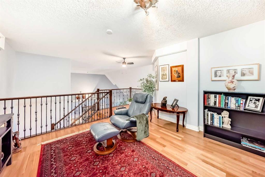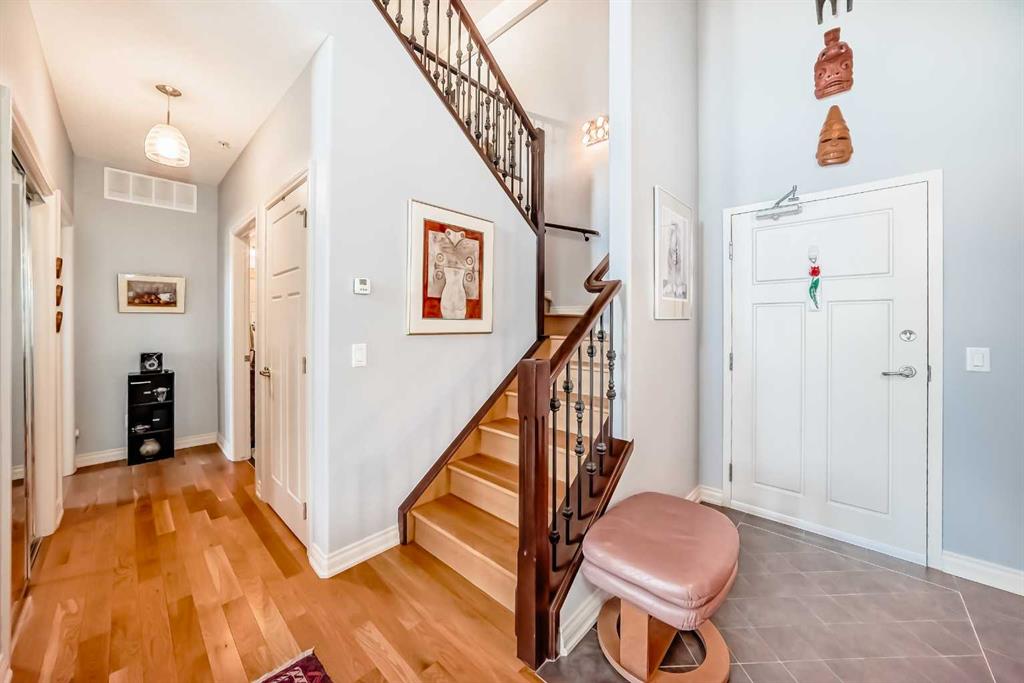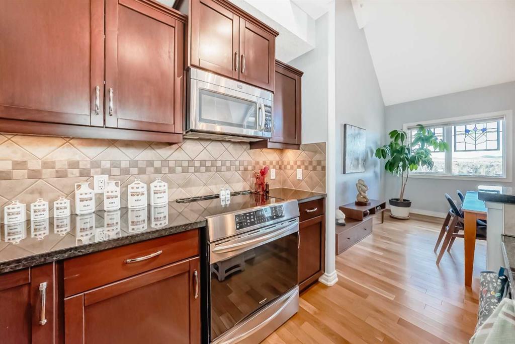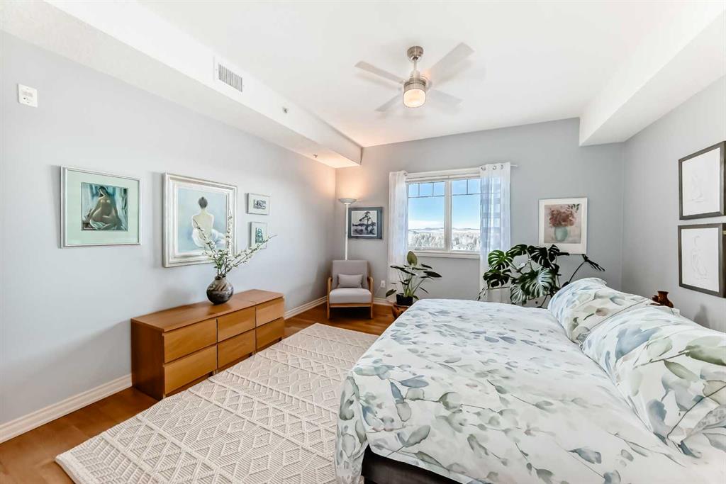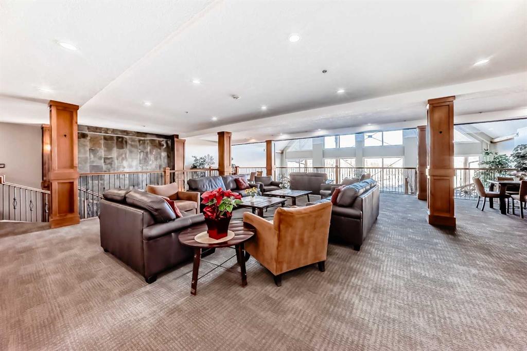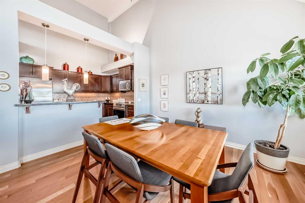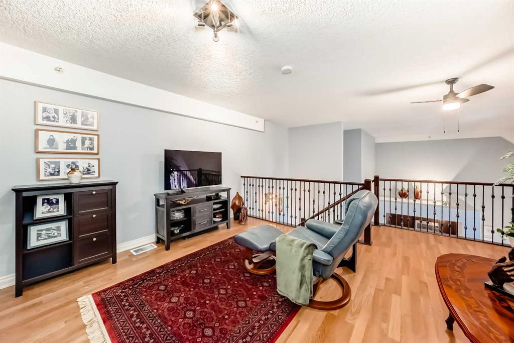 TOP FLOOR ~ WEST Facing with Mountain View~ Incredibly well taken care of with classic style. This 1 bedroom 2 bath condo with LOFT is beautiful. The additions added throughout the years make it simply stylish from the Hardwood Flooring throughout, Refaced Gas Fireplace, ( one of only two in the entire building) and classic paint colour. As you enter notice the Soaring Vaulted ceilings with windows that let in so much light, Tastefully designed kitchen with SS appliances, Breakfast Bar and a perfect cooking space. Ample dining area with the sit up breakfast bar makes for a great entertaining space. The living room with gas fireplace, and garden doors to the west facing balcony is a wonderful size. Up the stairs to the LOFT adds more living space for whatever you desire ~ TV room, Office, Guest bedroom, Library…… Back down the hall there is a closet, 4 piece main bath, and the Master Bedroom with walk through closet and 5 piece en suite. Love this tub shower combo. Heading out the garden doors to the deck there is a gas line for a BBQ and storage room which has been drywalled and wired with a light and plug in. Some have added a small chest freezer into this space. Perfect fit! The view from the balcony looks onto a forested area and greenspace and there is a mountain view. Stay warm in the winter months with in floor heating and in the SUMMER you have CENTRAL AIR to keep you COOL! This condo comes with 1 TITLED parking stall and there is unassigned parking outside the building that come with plug ins for winter. LOFTS on the BOW is a beautiful HIGHER end 55+ condo complex in Cochrane with a Mountain feel. There are 13 different common areas throughout the building including, Banquet Room and Kitchen, Pool table area, Fireplace Lounge, 7000 sq ft Courtyard with Fireplace and BBQ, Fitness Room, Library, 2 guest suites and more. Across from Lofts are pathways that lead to the Bow River and over to the shops. Easy access to the 22 and out to the Mountains or heading into Calgary. Always a sought after building View this property TODAY and live here TOMMORROW!