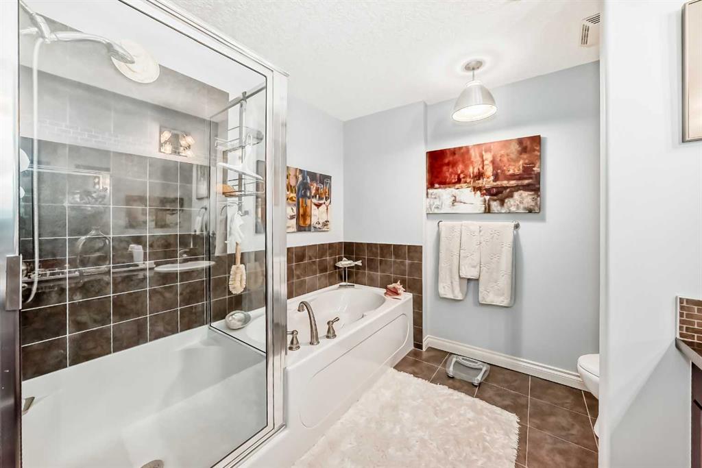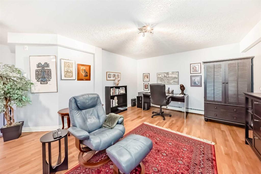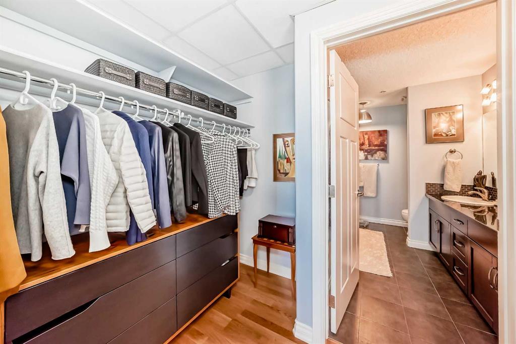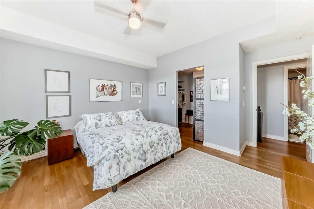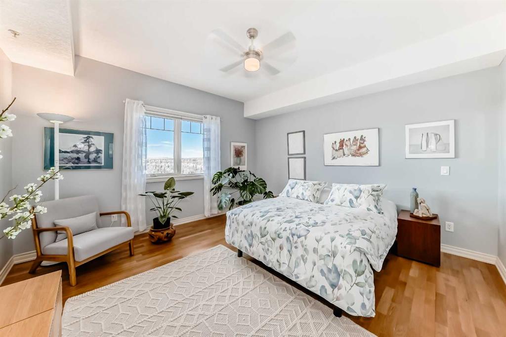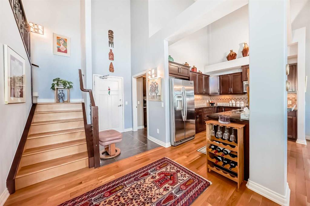 TOP FLOOR ~ WEST Facing with Mountain View~ Incredibly well taken care of with classic style. This 1 bedroom 2 bath condo with LOFT is beautiful. The additions added throughout the years make it simply stylish from the Hardwood Flooring throughout, Refaced Gas Fireplace, ( one of only two in the entire building) and classic paint colour. As you enter notice the Soaring Vaulted ceilings with windows that let in so much light, Tastefully designed kitchen with SS appliances, Breakfast Bar and a perfect cooking space. Ample dining area with the sit up breakfast bar makes for a great entertaining space. The living room with gas fireplace, and garden doors to the west facing balcony is a wonderful size. Up the stairs to the LOFT adds more living space for whatever you desire ~ TV room, Office, Guest bedroom, Library…… Back down the hall there is a closet, 4 piece main bath, and the Master Bedroom with walk through closet and 5 piece en suite. Love this tub shower combo. Heading out the garden doors to the deck there is a gas line for a BBQ and storage room which has been drywalled and wired with a light and plug in. Some have added a small chest freezer into this space. Perfect fit! The view from the balcony looks onto a forested area and greenspace and there is a mountain view. Stay warm in the winter months with in floor heating and in the SUMMER you have CENTRAL AIR to keep you COOL! This condo comes with 1 TITLED parking stall and there is unassigned parking outside the building that come with plug ins for winter. LOFTS on the BOW is a beautiful HIGHER end 55+ condo complex in Cochrane with a Mountain feel. There are 13 different common areas throughout the building including, Banquet Room and Kitchen, Pool table area, Fireplace Lounge, 7000 sq ft Courtyard with Fireplace and BBQ, Fitness Room, Library, 2 guest suites and more. Across from Lofts are pathways that lead to the Bow River and over to the shops. Easy access to the 22 and out to the Mountains or heading into Calgary. Always a sought after building View this property TODAY and live here TOMMORROW!
