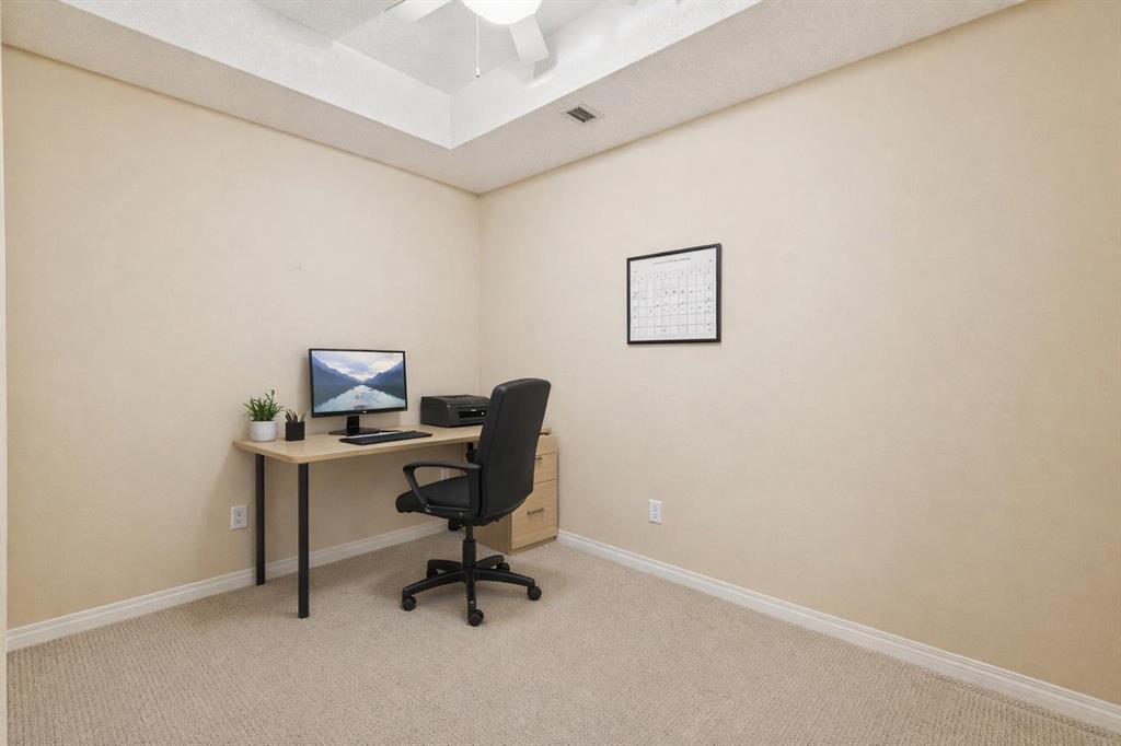 The kitchen offers warm oak cabinetry, ample counter space, a corner pantry, and a raised breakfast bar for casual dining and hosting. The primary bedroom features a walk-in closet and private 3-piece ensuite. A second bedroom is thoughtfully positioned on the opposite side for added privacy, while the separate den provides flexible space for a home office, hobby room, or reading retreat.