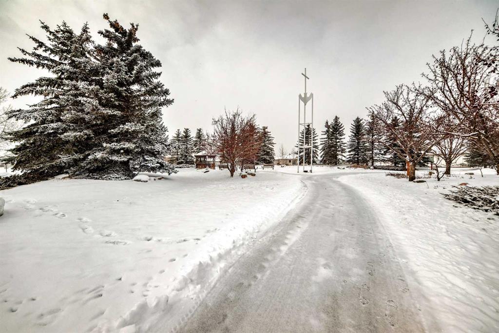 OPEN HOUSE February 1st 2-4, Welcome to Prince of Peace Village an Adult 55+ community on the edge of the City of Calgary. Easy access to the #1 highway and close to Calgary heading west or Chestermere heading east. Prince of Peace Village is a vibrant community with walking paths, Community Gatherings at the Centre and a natural setting. This villa comes with 2 bedrooms up, a 4 piece bathroom with dual access either from the Primary Bedroom or hall way. The Vaulted ceilings make the living room feel very spacious and open. A fireplace adds too the warmth of the area and the windows framing the fireplace bring in so much natural light. In the summer turn on the central air for comfort. throughout the home. The Kitchen is bright with a central island, and lots of counter & cupboard space. There is even a built in desk area. Dining Room is large enough for seating for 6. Sliding patio doors take you to a lovely patio with nature right at your door! The 2nd bedroom of this home is used as an office and could easily be the guest room or t.v. area. Laundry is also conveniently located on the main floor. This home is at the end of the cul de sac and there are no immediate neighbours to the west and is almost surrounded by greenspace. The condo fee includes snow removal, in winter and lawn care in the summer. Prince of Peace Village, a Beautiful place to call Home!