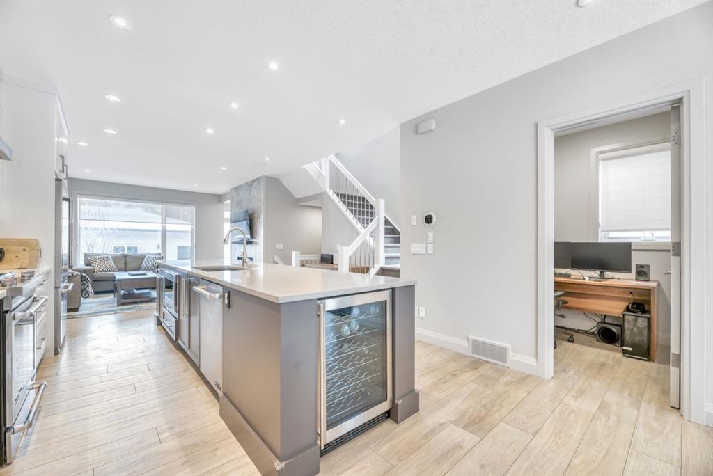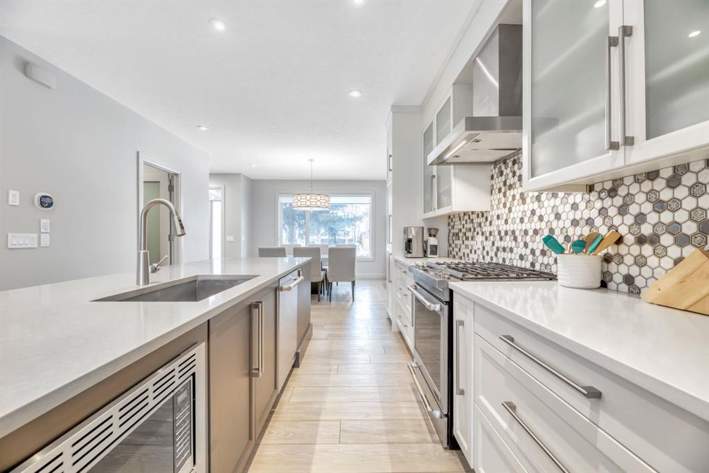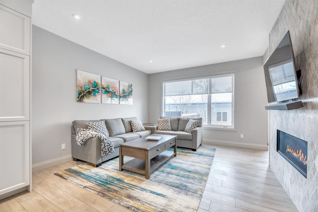 The chef-inspired kitchen is a true showpiece, featuring a premium Jenn-Air stainless steel appliance package, custom cabinetry, built-in wine cooler, and an impressive 13-foot quartz island with seating for four—perfect for entertaining. The space flows seamlessly into the dining area and inviting living room, anchored by a striking tiled gas fireplace for chilly winter nights. Central air also included for the future warm days of Calgary!
